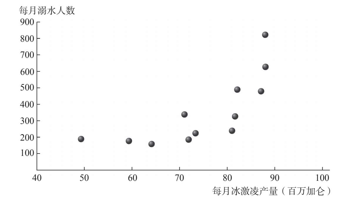 注:本图描绘了美国月度冰激凌产量与溺水人数的关系。这12个点分别代表着2011年的12个月。这两个变量存在因果关系吗?还是说某个遗漏变量导致了这两个变量的联动?提示:图中右上角的点是7月的数据,左下角的点是12月的数据!