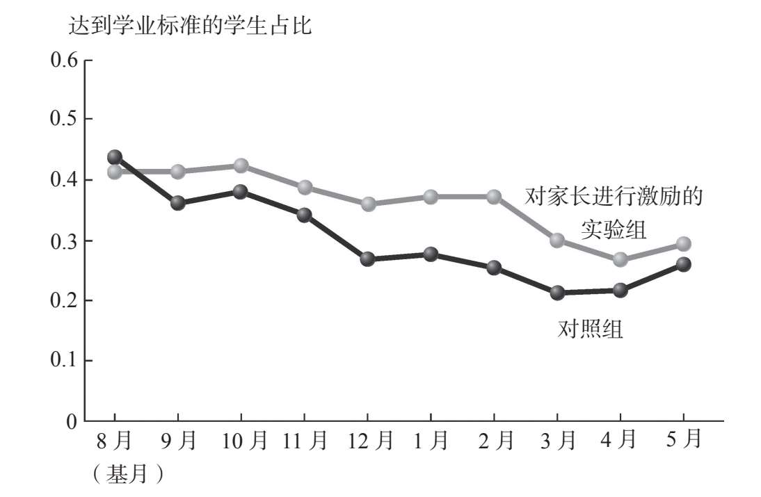 对家长进行激励的实验组: 学生每个月只要达到实验者设定的特定学业标准,他们的家长就会在该月获得50美元奖励。