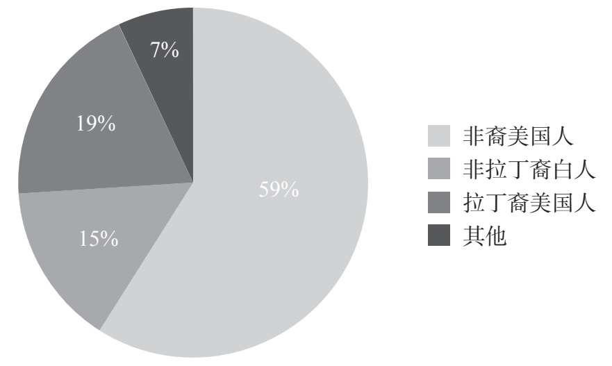 例如,在上述实验中,我们要求学生从下面各项中选择一个(且唯一的)类别:非裔美国人、非拉丁裔白人、拉丁裔美国人、其他。从图2A.1中我们得知,参与实验的九年级学生中有59%是非裔美国人。因此,我们将饼状图中59%的区域标记出来,并以其代表非裔美国人占所有实验参与者的比例。我们看到有15%的学生认为自己是非拉丁裔白人,在图中我们将其用相应图例表示。我们继续对参与者进行划分,直到整个圆被100%填满。这个圆所描述的就是实验参与者自我认同的种族和民族身份构成。