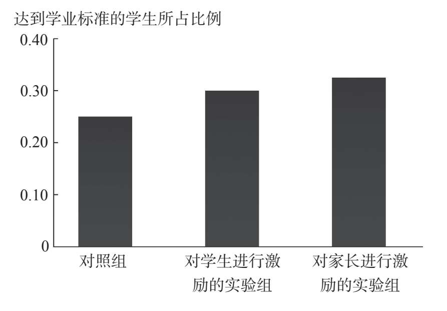注:柱状图便于对各组之间的数字进行对比。在本例中,我们可以通过比较每条柱子的高度来比较各组学生在达到学业标准方面的表现。例如,对家长进行激励的实验组的柱子比对照组的柱子高,这意味着对家长进行激励的实验组的学生达到学业标准的比例高于对照组。