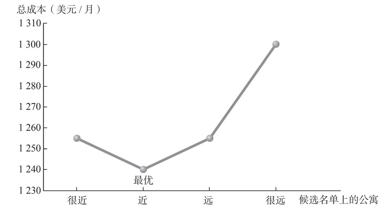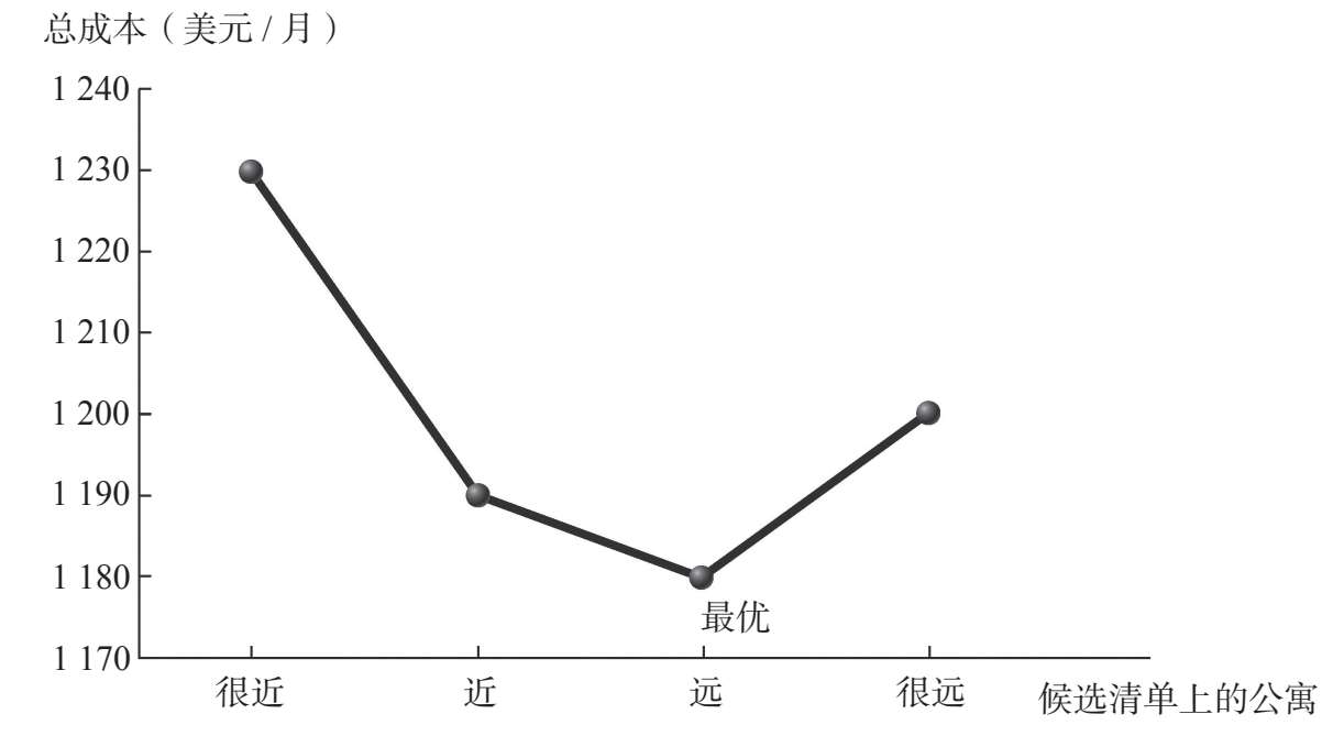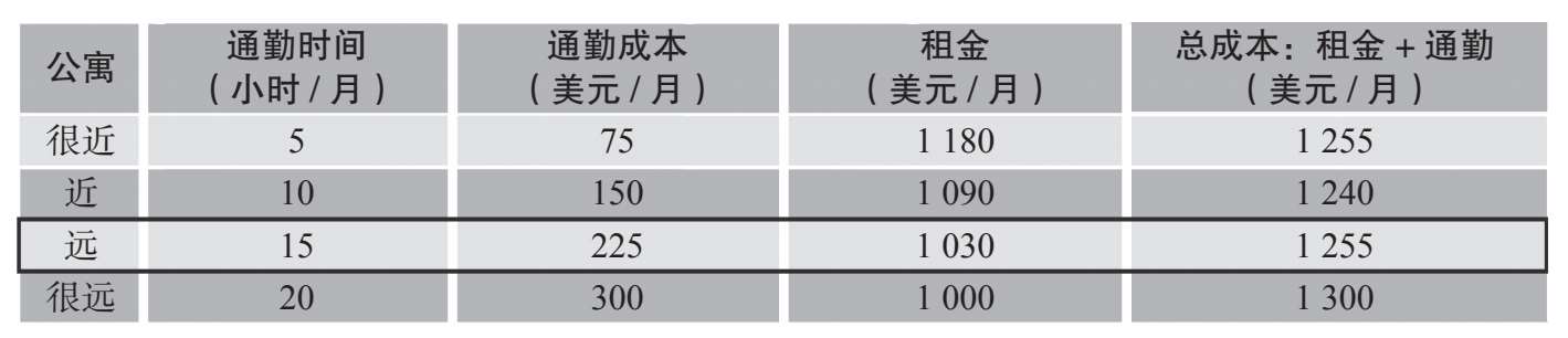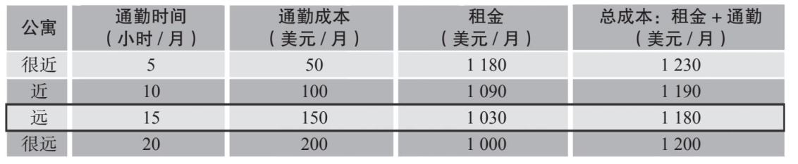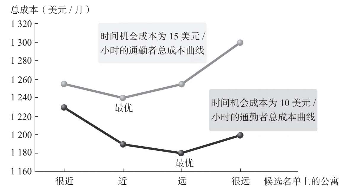 注:在机会成本为15美元/小时的情况下,最优选择是“近”。这套公寓的总成本最低,即直接租金成本和间接通勤时间成本之和最小。