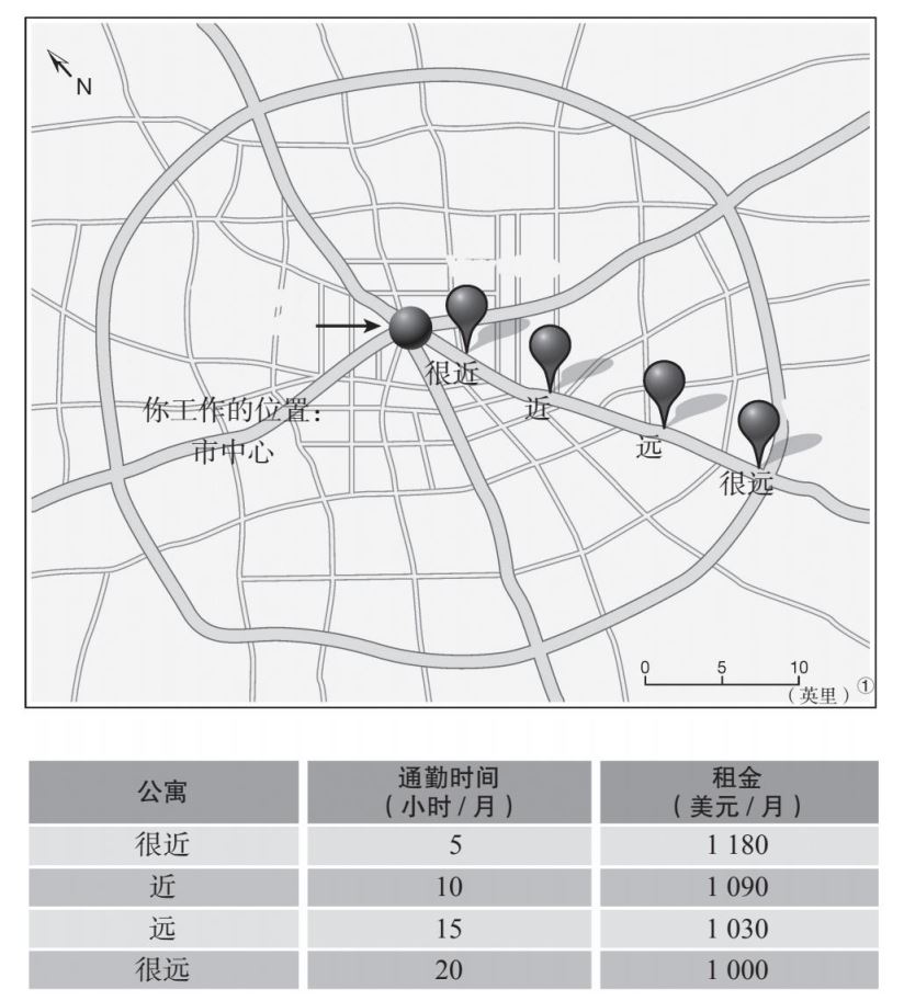 另外也请注意,我们在这个例子中只关注成本——通勤时间成本和租金成本。我们假设这些公寓在面积和周边环境等方面都不存在差别。这样一来,成本—收益分析就变得更为简单。在正常的成本—收益分析中,决策者寻找的是净收益(即收益减去成本)最高的选项。当所有选项的收益相同时,成本—收益分析就简化为寻找拥有最低成本的选项。这也是我们接下来要做的事。