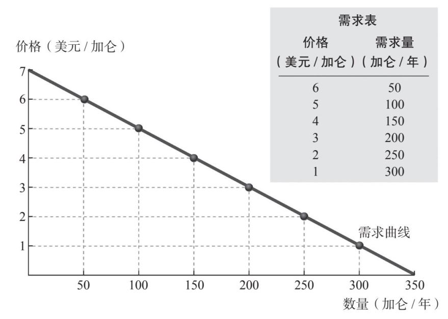 注:汽油价格越低,克洛伊会选择购买越多的汽油。换句话说,当汽油价格降低时,她的需求量会增加。因此,需求曲线是向下倾斜的——高价格(纵轴或 y 轴)会导致低需求量(横轴或 x 轴);低价格( y 轴)则导致高需求量( x 轴)。