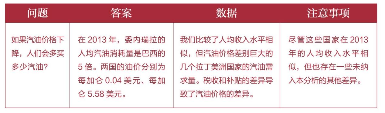根据需求定律,在其他条件不变时,更低的价格会导致更高的需求量。事实上,在2013年,委内瑞拉的人均汽油消耗量几乎是巴西的5倍。