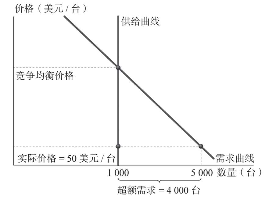 注:当每台笔记本电脑的价格固定为50美元时,亨利科县出现了一种超额需求的局面。在这个价格下,需求量(5 000台)超过了供给量(1 000台)。要想使需求量等于供给量,就需要设定一个更高的价格,即竞争均衡价格。垂直的供给曲线则反映了这样一个事实:以50美元价格销售的笔记本电脑的供给量被固定为1 000台。