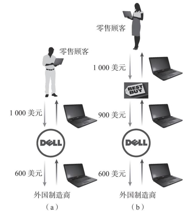 注:在图(a)中,一位美国消费者直接通过戴尔,以1 000美元的价格购买了一台戴尔笔记本电脑。由于这台电脑是戴尔以600美元的价格从外国制造商那里购得的,因此戴尔的增加值为400美元(1 000美元-600美元)。在图(b)中,一位美国消费者从百思买以1 000美元的价格购买了一台戴尔笔记本电脑。由于百思买为这台电脑向戴尔支付了900美元,而戴尔为此向一家外国制造商支付了600美元,因此戴尔的增加值仅为300美元(900美元-600美元)。