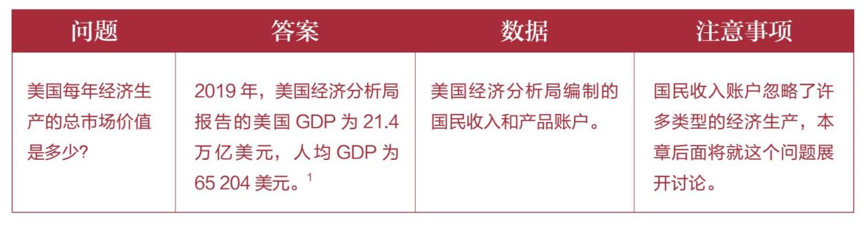政府统计人员会仔细测算GDP,即经济产出的总市场价值。在美国,这项任务归商务部的经济分析局负责。2019年,美国经济分析局报告的美国GDP为21.4万亿美元。同年美国人口为3.282亿。因此美国当年的人均GDP约为65 204美元。注意,人均GDP等同于人均收入,我们在本章之初就做过介绍。