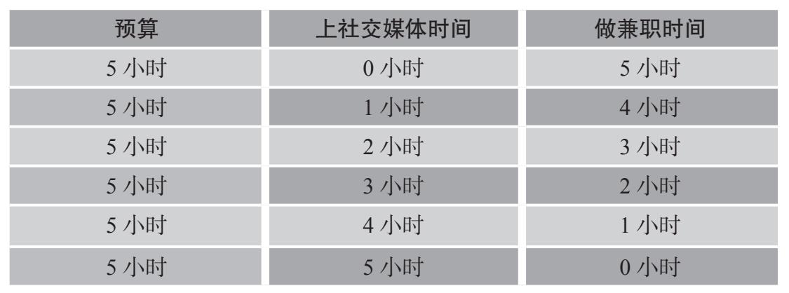 注:假设5小时的空闲时间只能用于上社交媒体或做兼职,表中每行代表一种不同的时间分配方式。为简化分析,表中仅列出整数情况。