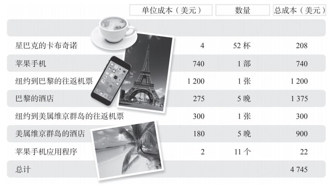 注:每个人都会选择以自己独特的方式花掉这4 745美元。本表展示了一个可行的商品和服务组合。注意,本表只包括商品或服务的货币成本。一个完整的经济分析应该还包括消费这些商品或服务所需的时间机会成本。 JPY8PRx+LLEteKOB1aNkjOvrF5EStw6PWTPMyaH80lVRdTYpVRb8LxDNKay9NK0/