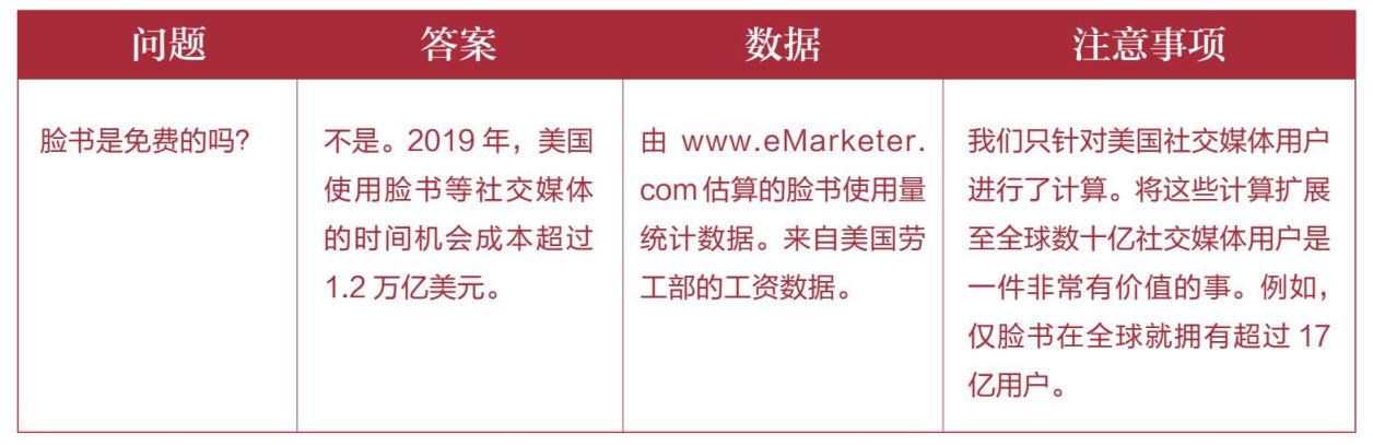 据估算,2019年美国成年人每天花在社交媒体平台上的平均时长为56分钟,这些社交媒体平台包括脸书、TikTok、照片墙、Snapchat(色拉布,一款照片应用分享)、推特、Pinterest(拼趣)、Tumblr(汤博乐,全球最大的轻博客网站)和领英等网站。 为了简化计算,我们把这一时长扩展为每日1小时。即便我们选择一个相对保守的时间机会成本,即每小时13美元,也使得每个美国人每年的时间机会成本达到4 745美元: