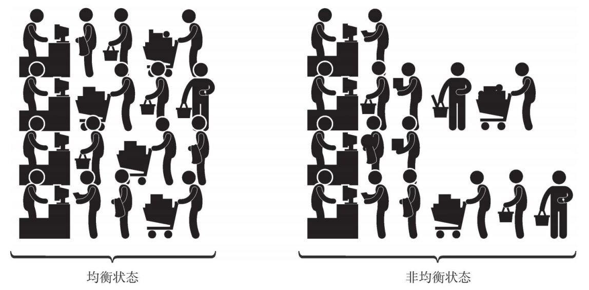 为了直观地理解均衡概念,想想你所在地区超市的常规付款通道的排队长度(不包括快速付款通道)。如果一个队的等候时间比其他队短,优化者就会选择那个队。如果一个队的等候时间比其他队长,优化者就会避开那个队。所以短的队会吸引购物者,而长的队会劝退购物者。但队伍的长度并非唯一影响因素。你会根据自己所看到的一切,包括每个人购物车里东西的数量,来估计哪一队会更快,从而决定排哪一队。有时候,你可能会等得更久,因为可能会发生一些意想不到的事情,例如一位顾客花了5分钟才找到合适的零钱,或者某位顾客的购物车底部堆满了待结账的小物件。但经济学家仍会说“在均衡状态下”,所有的结账队伍等待时间大致相同。当预期所有队伍的等待时间相同时,没有购物者会想要更换队伍,换句话说,没有人会认为他们能通过更换队伍而获利。