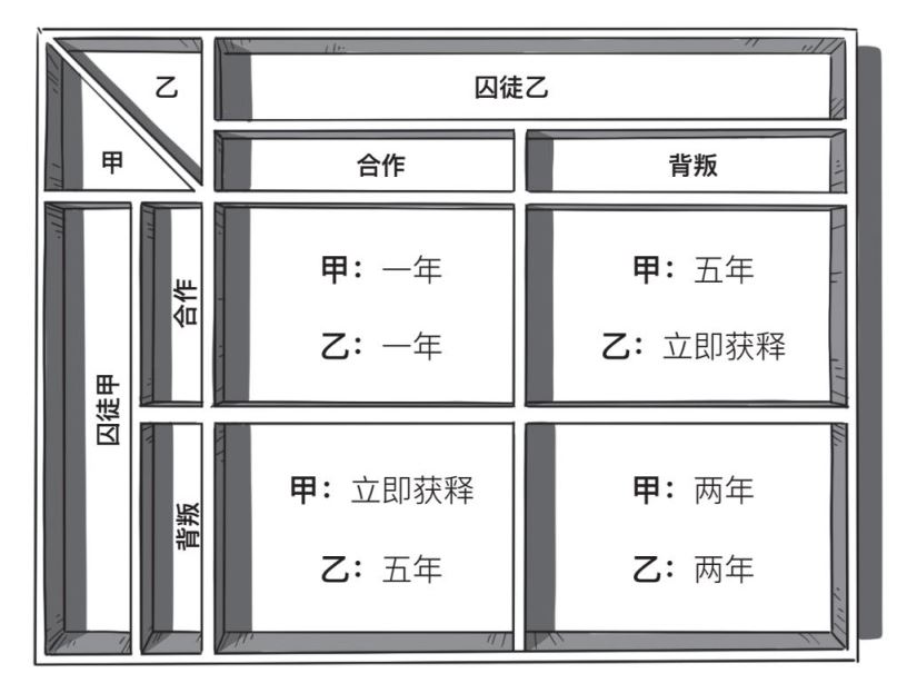 这个思想实验内容如下:两名被指控共谋犯罪的嫌疑人被关在不同的牢房里,无法沟通。警方虽然缺乏足够的证据给两人定罪,但仍有较大的把握,希望确保两名嫌疑人都在监狱里待上一段时间,于是,他们向二人提出了一项交易,即他们可以按照以下条件揭发对方的罪行: