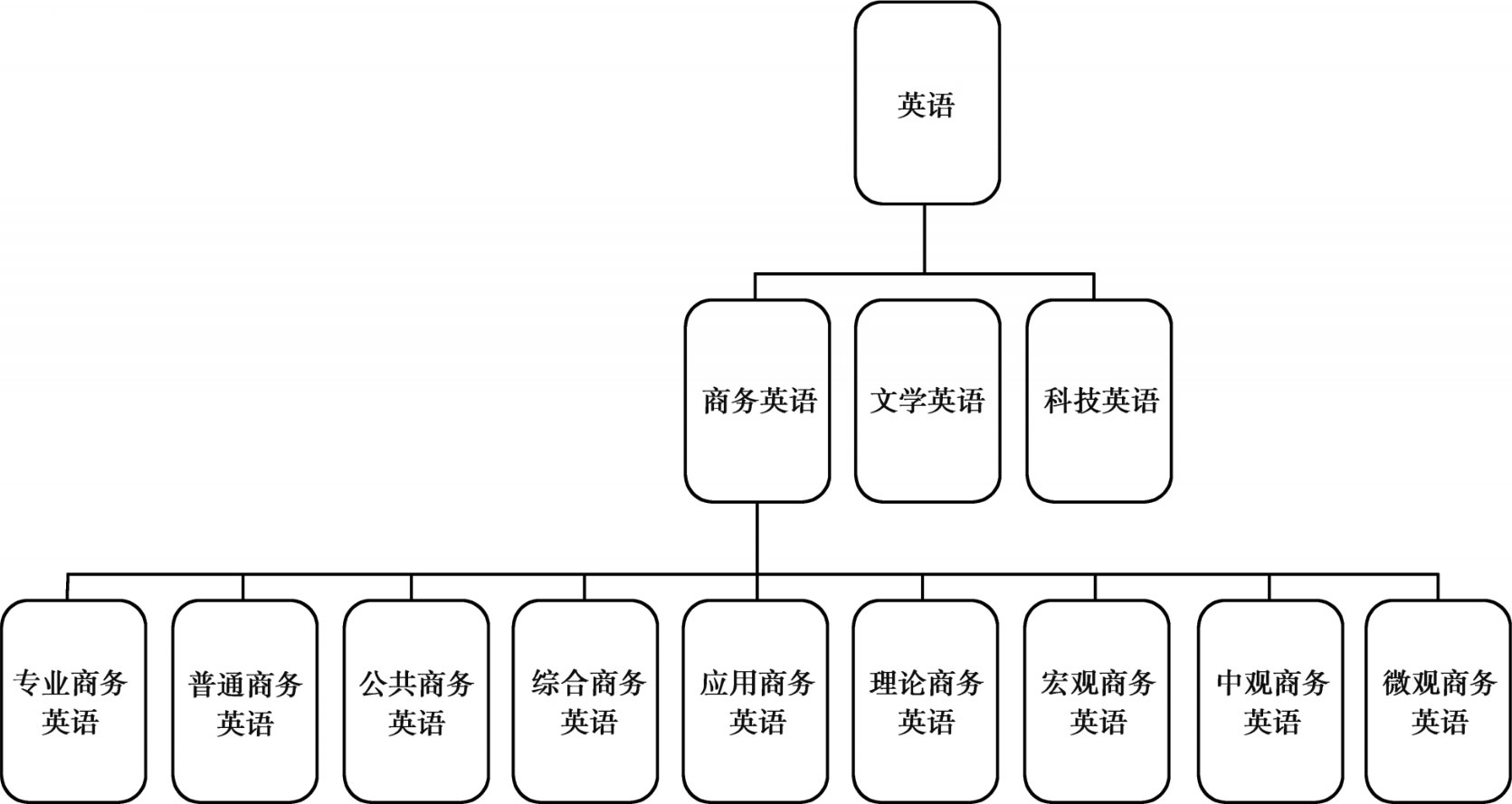 如图1.3所示,商务英语与文学英语、科技英语并列同属于英语的分支。商务英语专业(英语语言商务专业)与英语语言文学专业都属于英语类专业,但两者有所不同。英语语言文学专业以语言文学知识作为其依托,而商务英语则将国际商务知识体系作为其依托。专业商务英语则是商务英语专业的重要课程。专业商务英语相对普通商务英语而言,两者的区别主要反映在教学目标上。