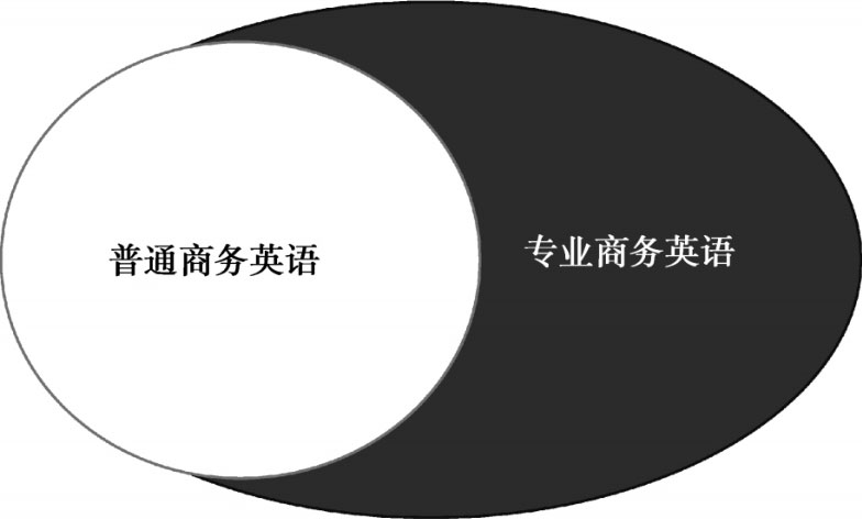 如图1.4所示,专业商务英语也包含普通商务英语,专业商务英语中突出国际商务专业知识的那部分为专业商务英语所特有。如普通商务英语中的国际营销,仅涉及国际营销的最基本的知识,如营销组合(marketing mix)、市场细分(market segmentation)等基本概念,而与普通商务英语相对的专业商务英语不仅包括这些概念的基本知识,还涉及这些营销概念更深层的意义。专业商务英语所涉及的有关国际营销的知识内容远远多于普通商务英语所涉及的国际营销内容。换言之,在商务英语教学中,对普通商务英语的学生只需要传授有关商务术语及其基本概念,而对专业商务英语的学生则需要进一步传授相关专业知识,以及更多的其他相关知识,让学生学到更多的有关专业的英语语汇。仍以国际营销为例,普通商务英语所涉及的国际营销知识少于专业商务英语所涉及的该领域的知识,对学生的学习要求也不尽相同。