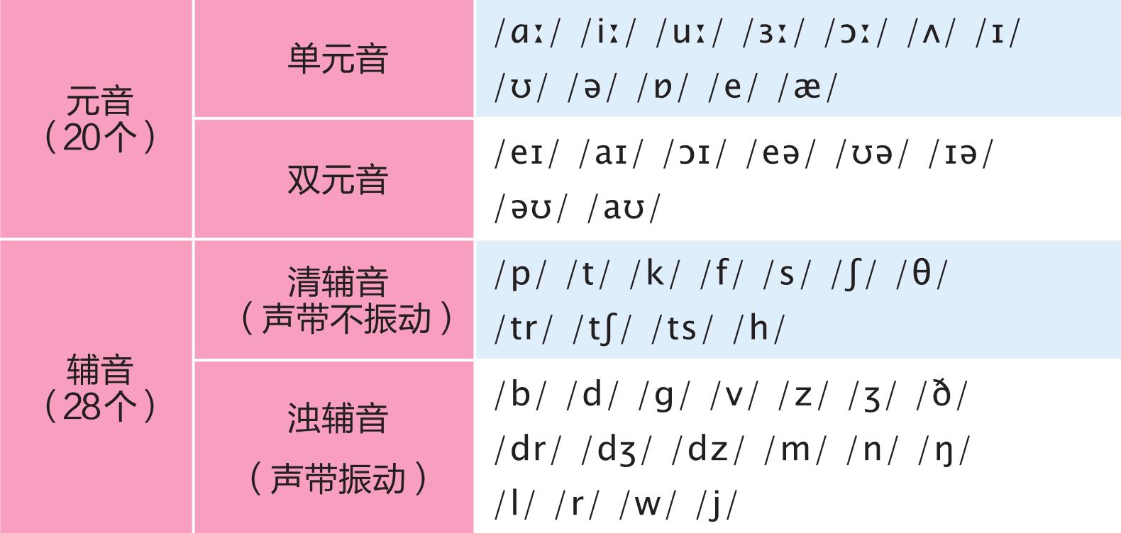 国际音标以“一音一符,一符一音”为原则,一共有107个符号,对应了107个音素,主要用于标注印欧语言、非洲语言和一些少数民族语言。英语音标仅为国际音标中用于英语的一部分,共计48个,含20个元音和28个辅音,少于汉语拼音的63个,并且这48个音标中有40个的发音与汉语拼音非常类似,相对容易掌握,其他8个是在汉语拼音中不存在的音,需要我们着重练习。