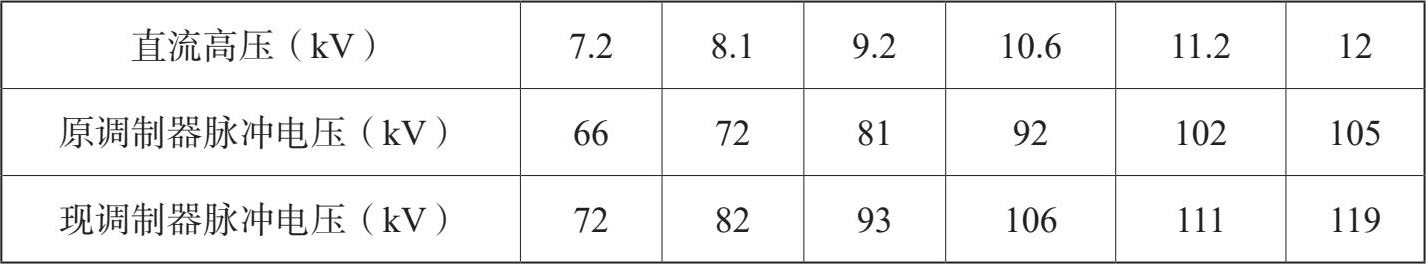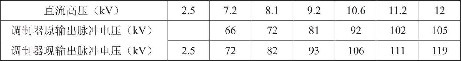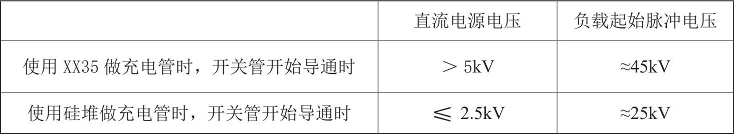 使用硅堆做充电管之后,发现调制器效率有所提高,且负载起始脉冲电压变低。在使用XX35 做充电管时,直流电源电压在 5kV以上时,负载脉冲电压才开始有输出。而使用硅堆做充电管后,直流电压加到 2.5kV左右时,即有负载电压输出。