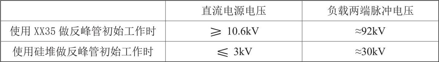 反峰管:由原氢闸流管XX35 改用硅堆 2DL-1/30(1A,30kV,3 只串。串联是为了增加元件的耐压),并在回路里加接限流电阻(线绕电阻220Ω、100W,两只串联)和电流继电器(保护硅堆过载)及电流表(指示反峰电流的平均值,该值小于 150mA),在直流电源加 3kV时,电流表即有指示,表示反峰保护电路正常工作。