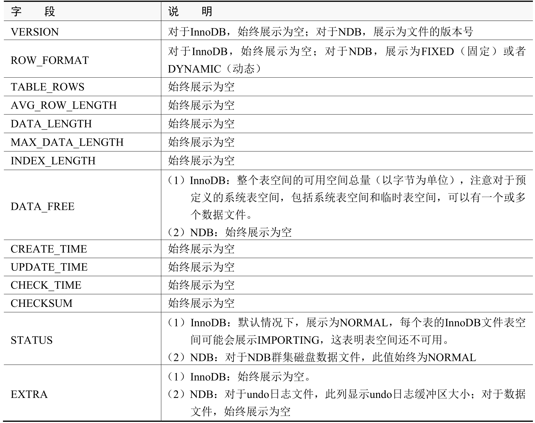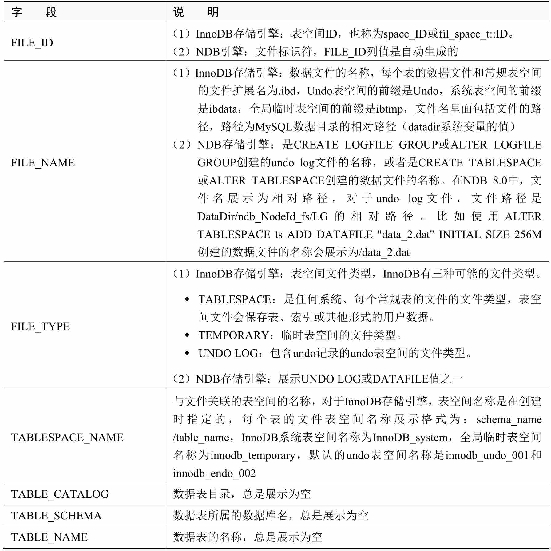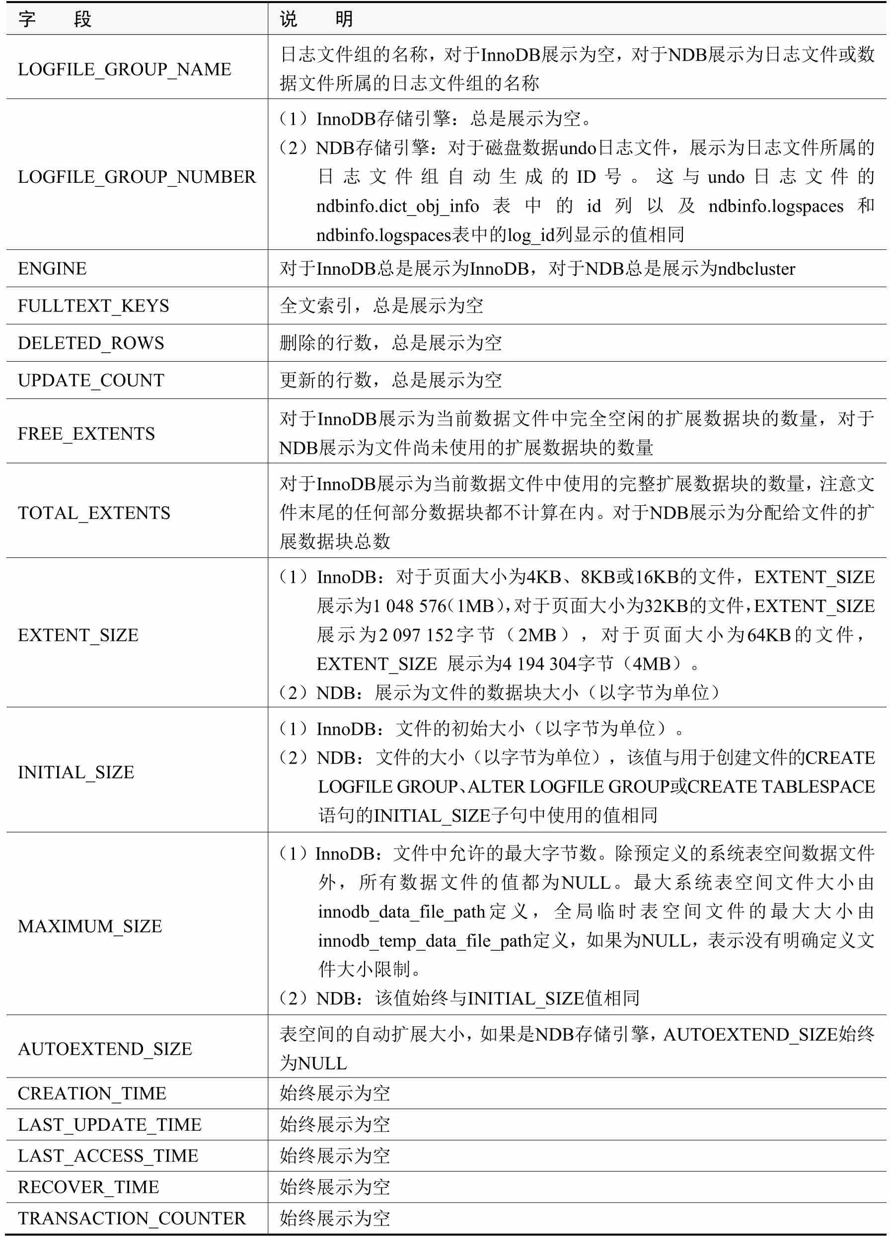 (5)Files表:提供了有关存储MySQL表空间数据文件的信息,详细描述如表2-8所示。
