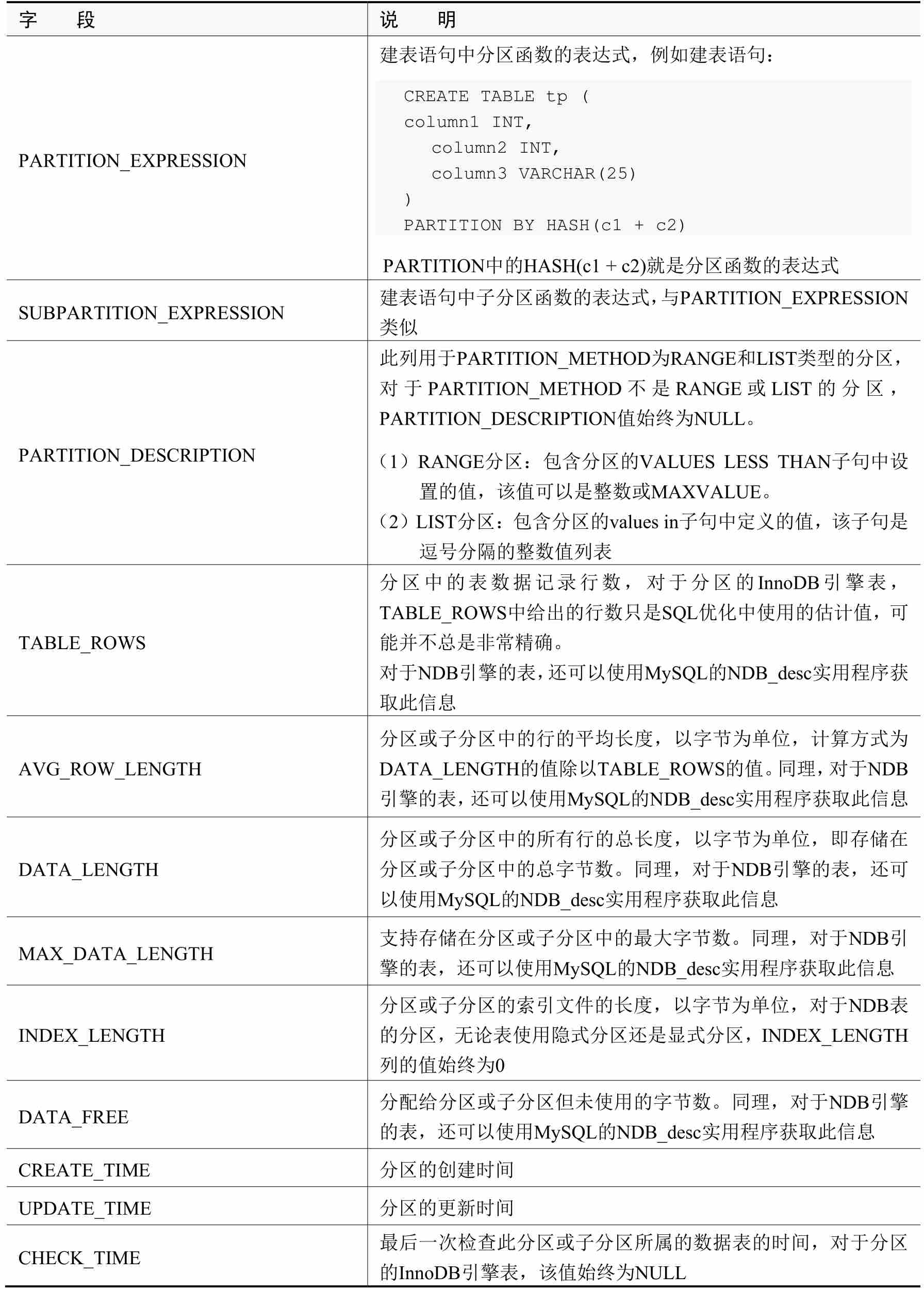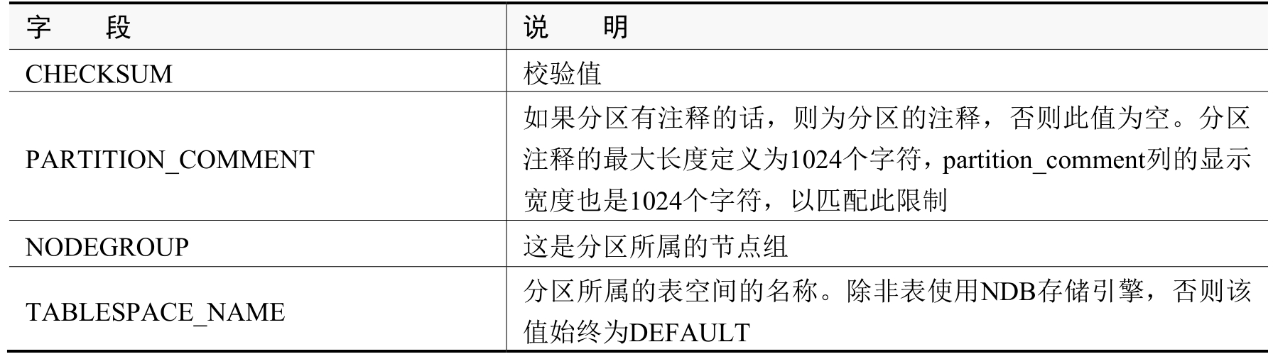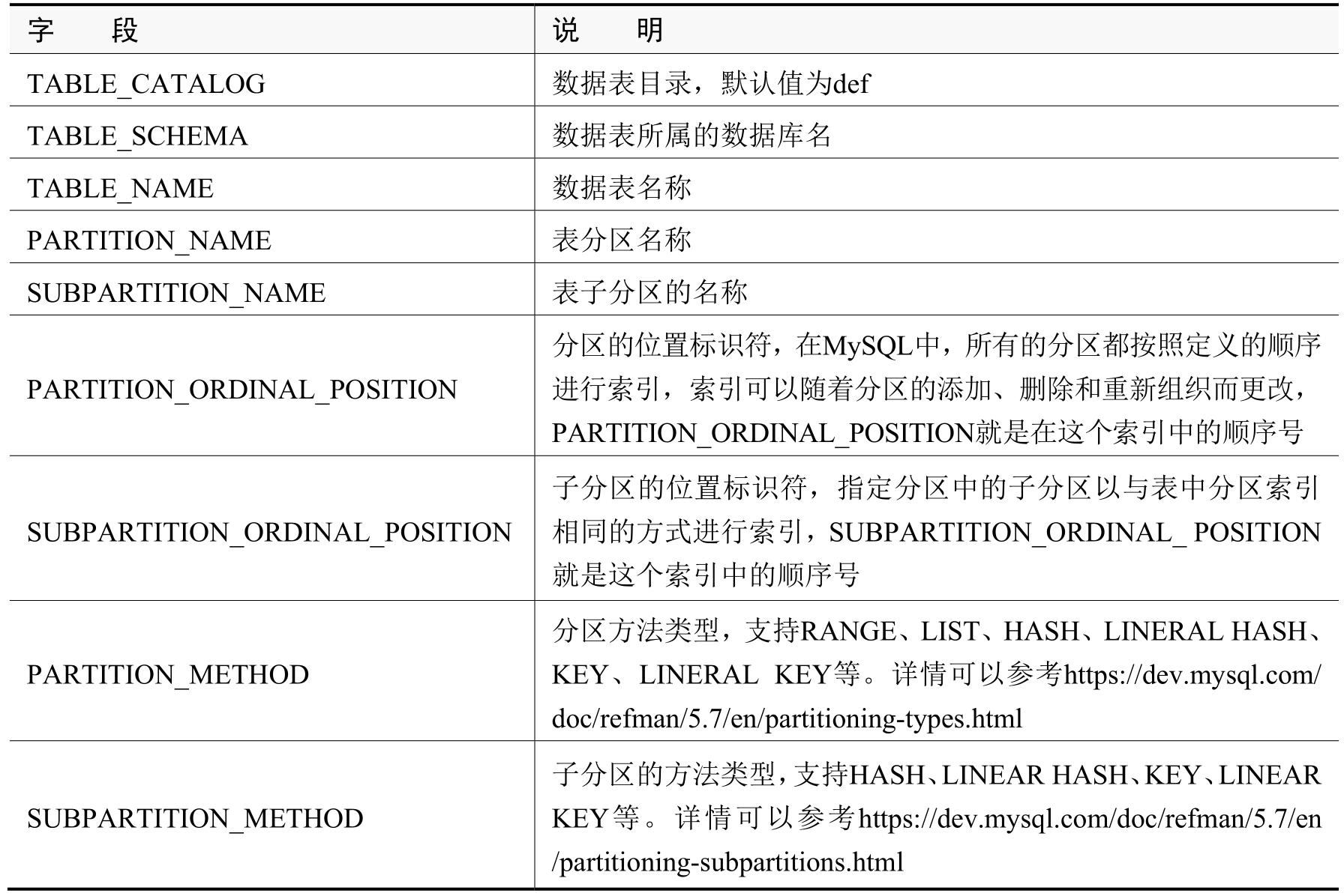 表2-7 Partitions表字段