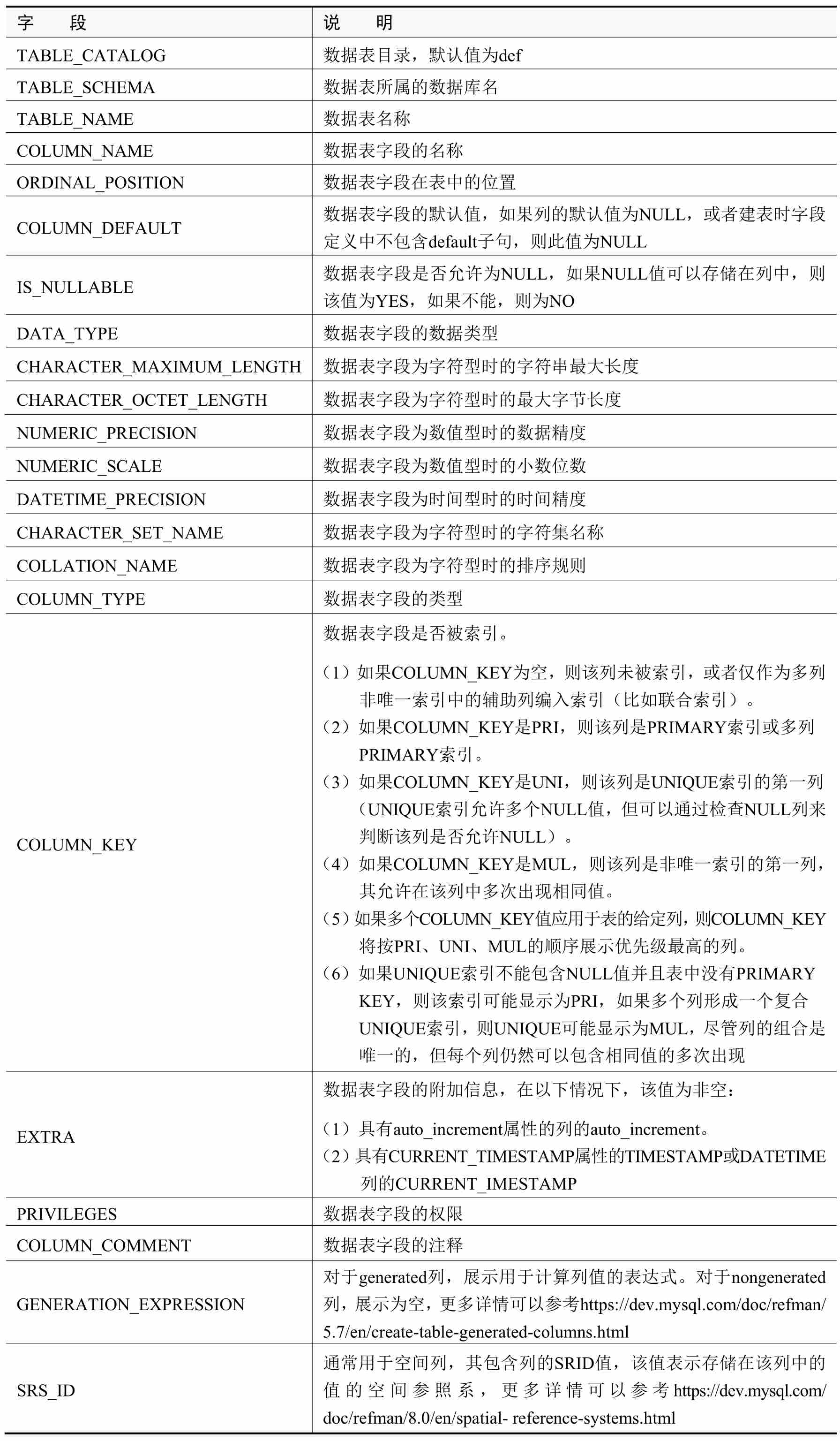 (2)Columns表:提供了数据库中表字段的相关信息,详细描述如表2-5所示。