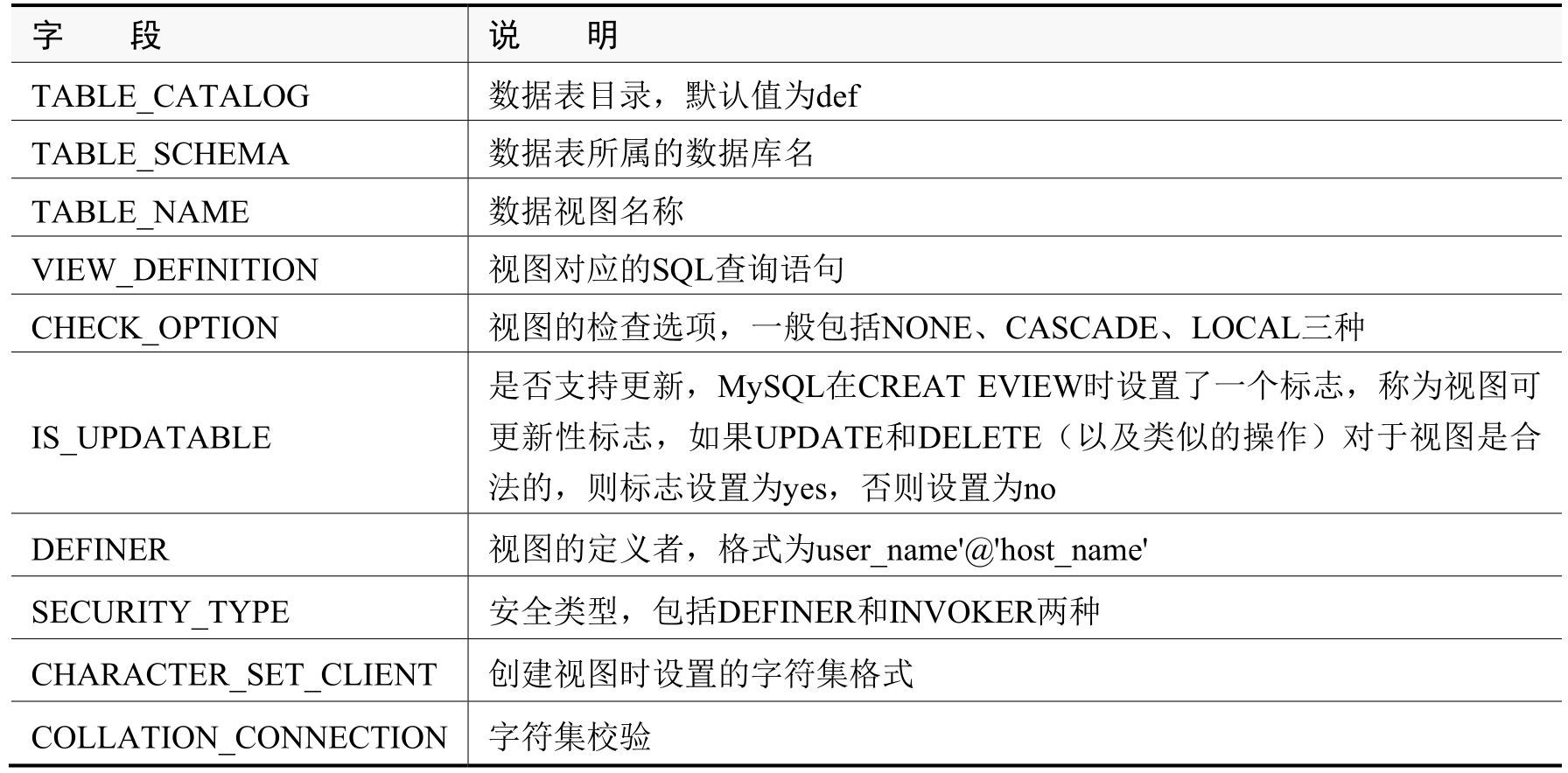 (3)Views表:提供了数据库中视图的相关信息,详细描述如表2-6所示。