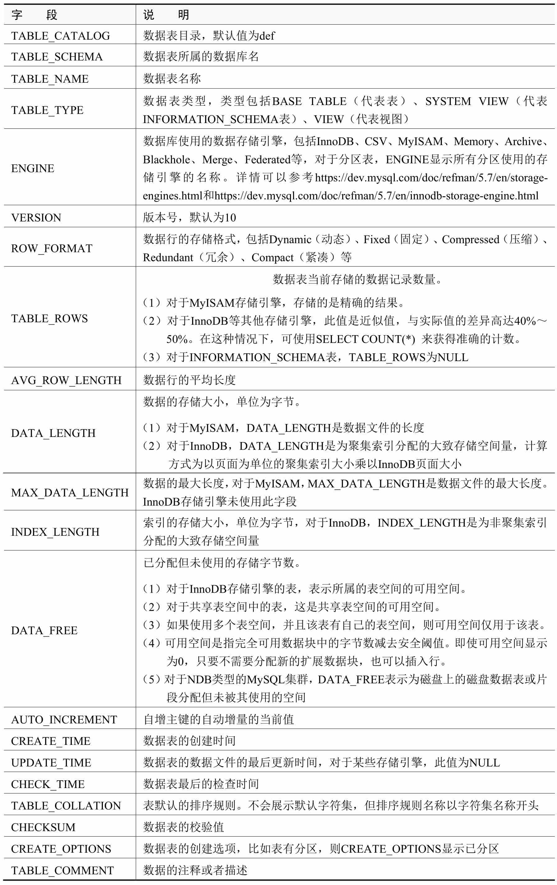 (1)Tables表:提供了数据库中的表、视图等信息,详细描述如表2-4所示。