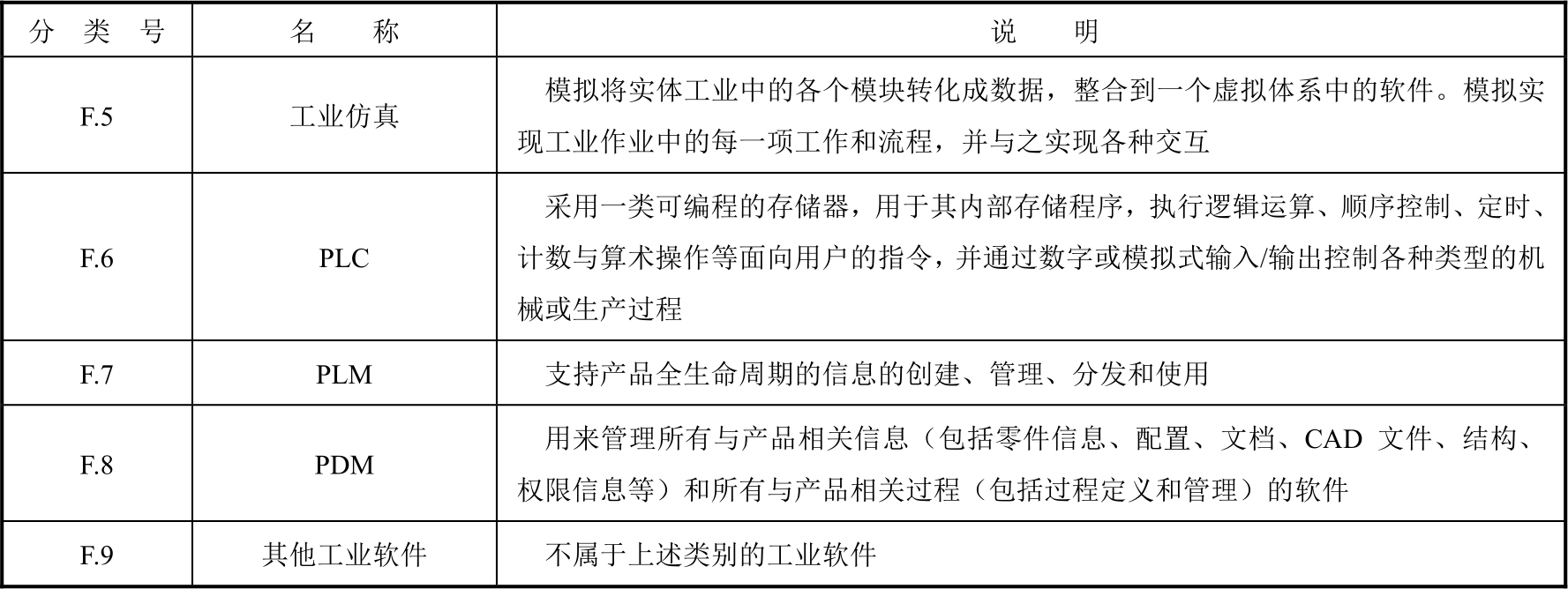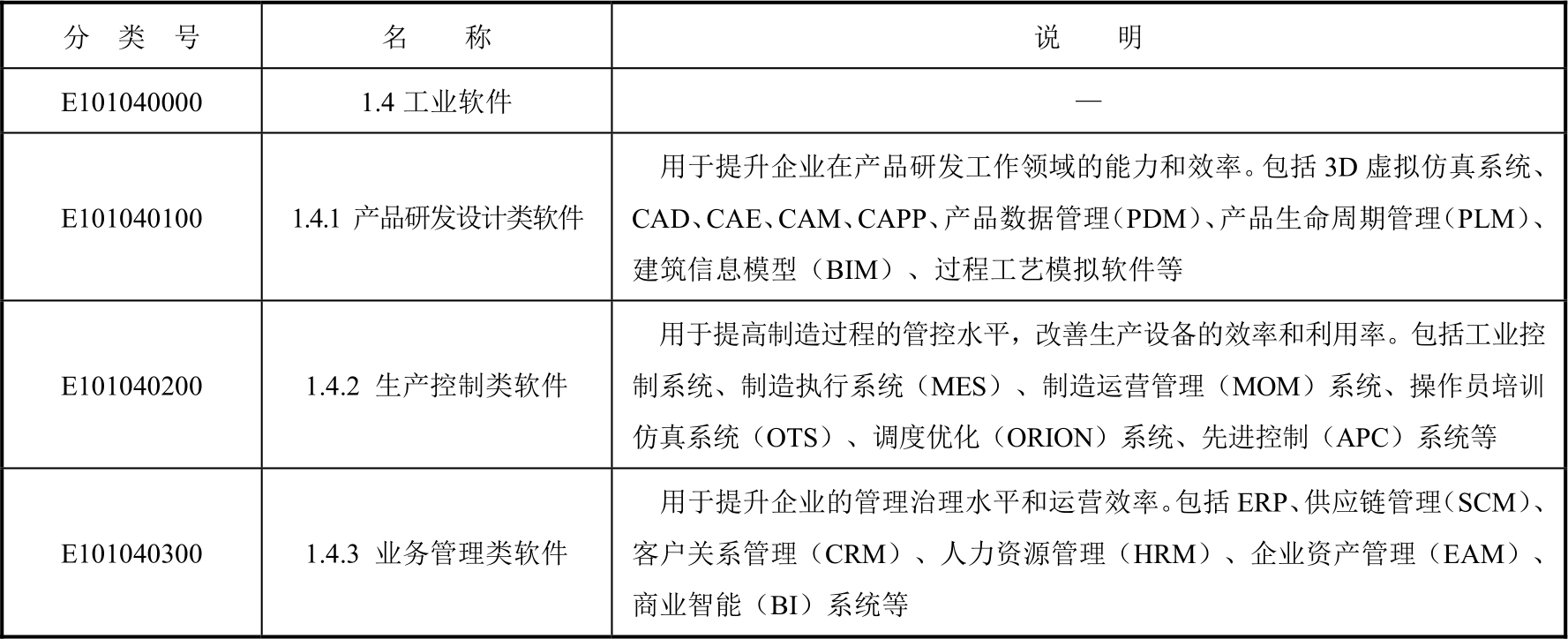 在GB/T 36475-2018《软件产品分类》中,工业软件分为工业总线、CAD、CAM、计算机集成制造系统等9大类,具体如表1.4所示。