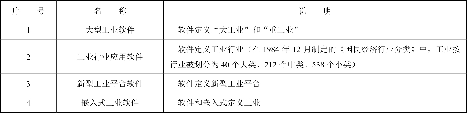 据此,工业软件主要分为大型工业软件、行业应用软件、新型平台软件和嵌入式软件,具体如表1.2所示。其中,大型工业软件聚焦“大工业”和“重工业”,是工业软件的核心;行业应用软件主要是指工业中细分行业的应用软件,即工业行业应用软件;新型平台软件是指工业中的新业态与新经济类、跨界融合集成类或新型架构平台类软件,即新型工业平台软件;嵌入式软件主要是指工业场景中的嵌入式操作系统、嵌入式应用软件和嵌入式支撑软件,即嵌入式工业软件。