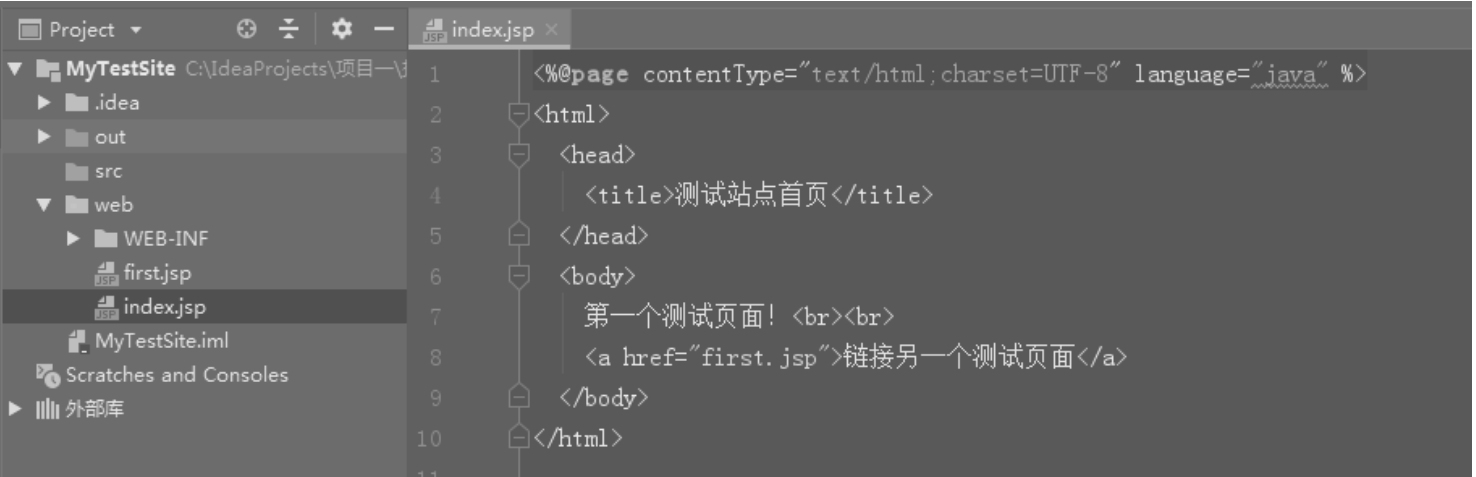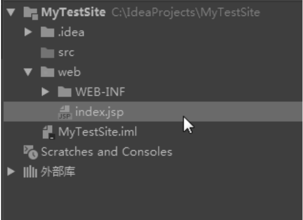 (3)创建项目之后,在IDEA的项目管理面板中,将显示出项目的整体结构。一般情况下,把Java程序中的包和类等内容放在src(源文件)目录下,把网站的静态与动态网页以及相关网站资源放在web目录下。项目创建后会默认提供一个初始的网站首页,其初始结构如图1-33所示。