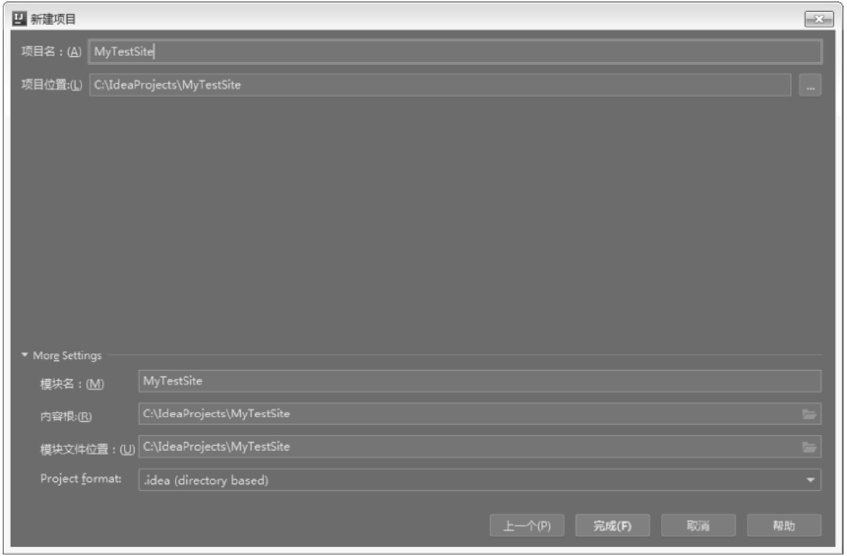 (2)选择所创建项目的类型之后,在后续界面中为项目命名(此处将项目命名为MyTestSite),并指定项目存储的路径,然后单击“完成”按钮,如图1-32所示。