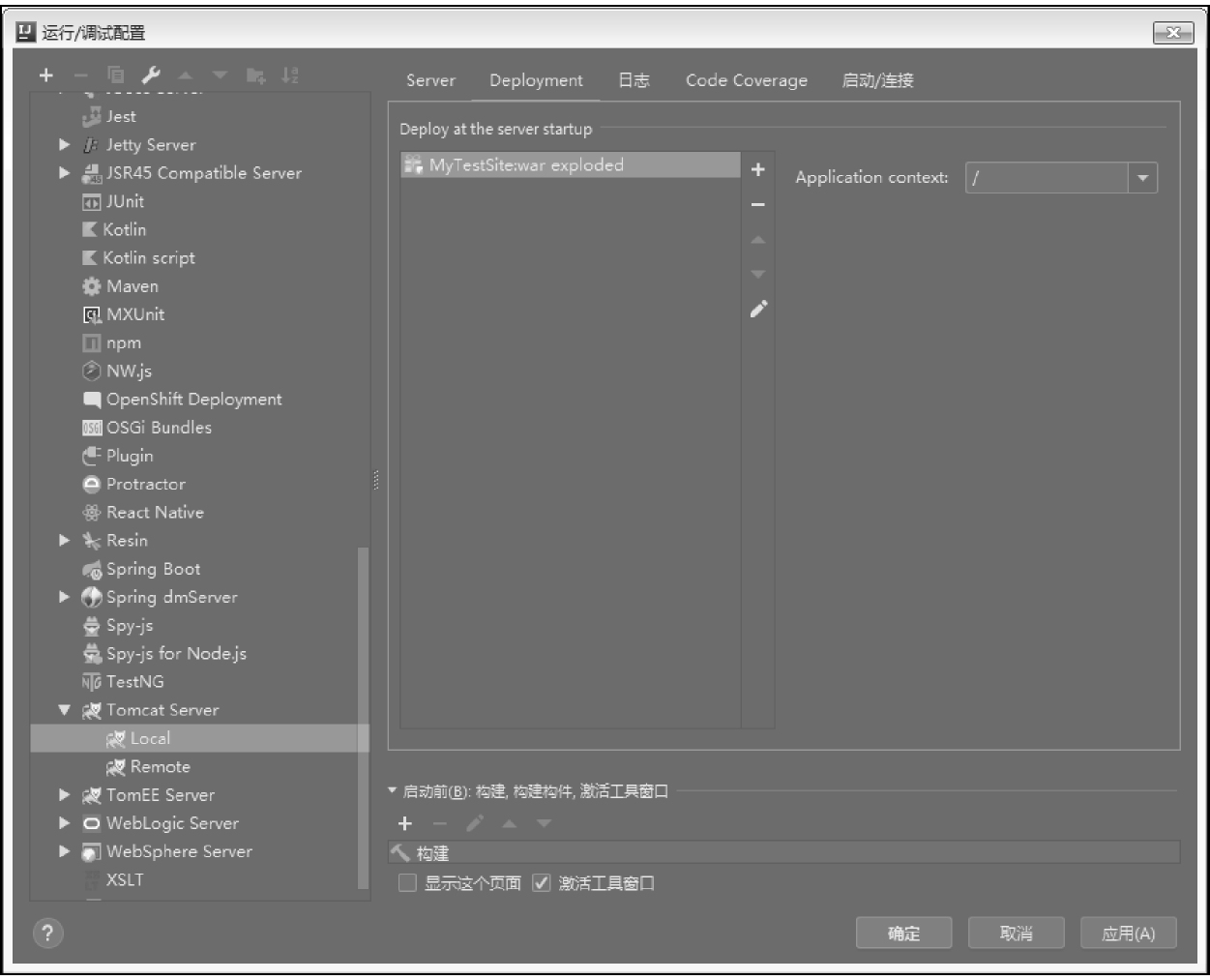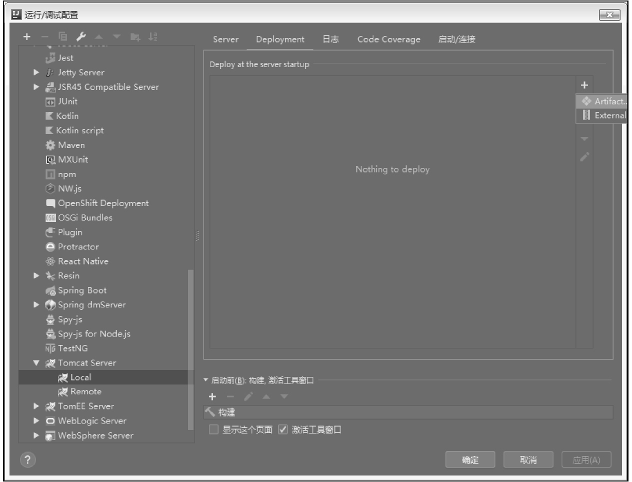 (2)在弹出的“运行/调试配置”对话框左侧列表框内选择“Tomcat Server”下的“Local”。选择“Local”后,对话框的右侧会出现配置界面。单击“Deployment”标记。在该标记页中,单击“+”按钮,在弹出的菜单中选择“Artifact”命令,如图1-39所示,将项目部署到Tomcat服务器上,如图1-40所示。