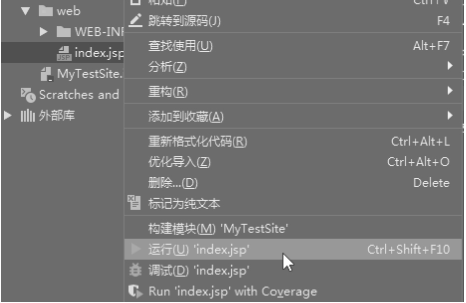 (3)在项目结构中,选择“index.jsp”,单击鼠标右键,在弹出的快捷菜单中,选择“运行‘index.jsp’”命令,如图1-41所示。