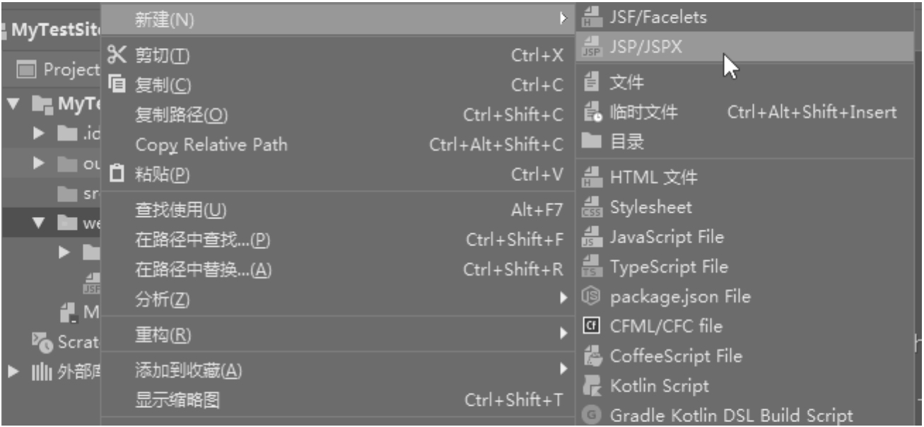 (1)根据之前介绍的项目需求,创建另一个JSP页面first.jsp。选择项目结构中的“web”文件夹,单击鼠标右键,在弹出的快捷菜单中,选择“JSP/JSPX”命令,如图1-34所示。