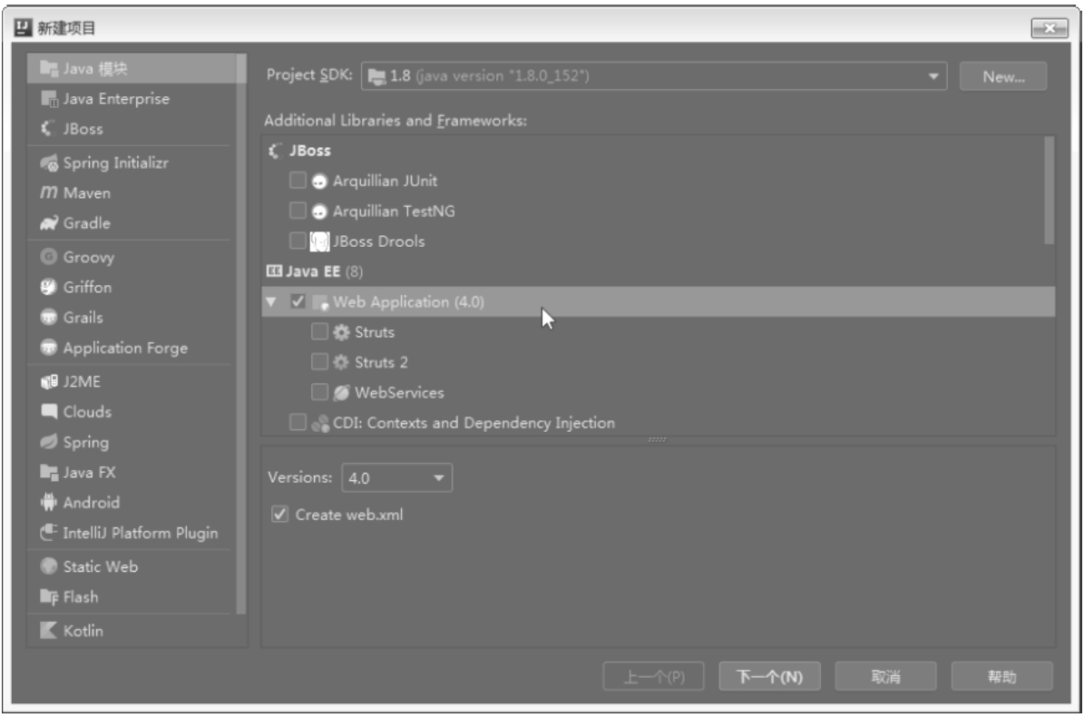 (1)启动IDEA后,在IDEA主工作界面中,依次选择“File”→“New”→“Project”菜单项。单击“Project”菜单项之后,出现“新建项目”对话框。选择对话框左侧列表框内的“Java模块”。在对话框右侧区域选项中勾选“Web Application”选项,然后单击“下一个”按钮,如图1-31所示。