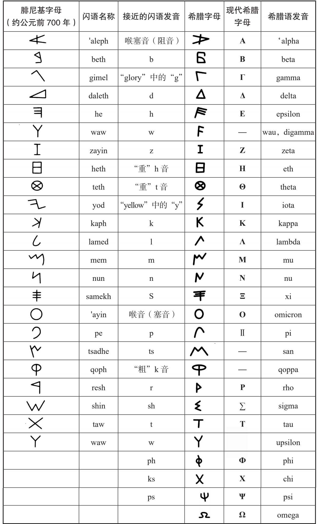 注:希腊字母在两处使用了“ waw ”符号:一为“ digamma ”,它有英文中“ w ”的音;一为新出现的五个元音之一“ u ”。后来,希腊人放弃使用“ digamma ”,不过,它通过拉丁字母表(希腊字母的西方形式)作为字母“ F ”流传下来。和“ qoppa ”与“ k ”相似一样,“ san ”是“ s ”音的替代符,不过,“ qoppa ”作为英文字母“ q ”保存下来(它只用于字母“ u ”前面)