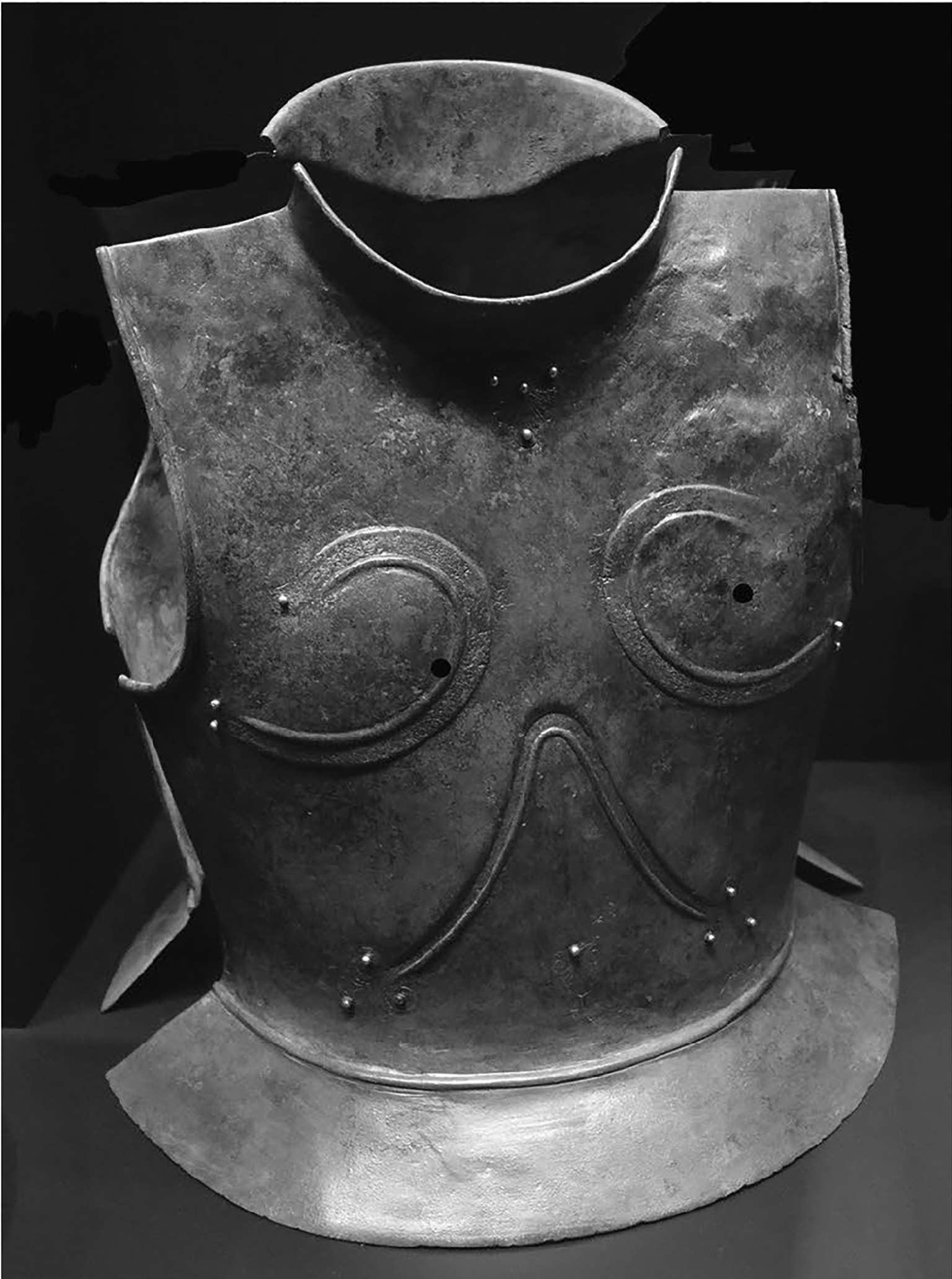 图5.5 一个墓葬出土的胸甲,造于约公元前650年。胸甲艺术化地表现了男性的胸肌和腹肌的形状