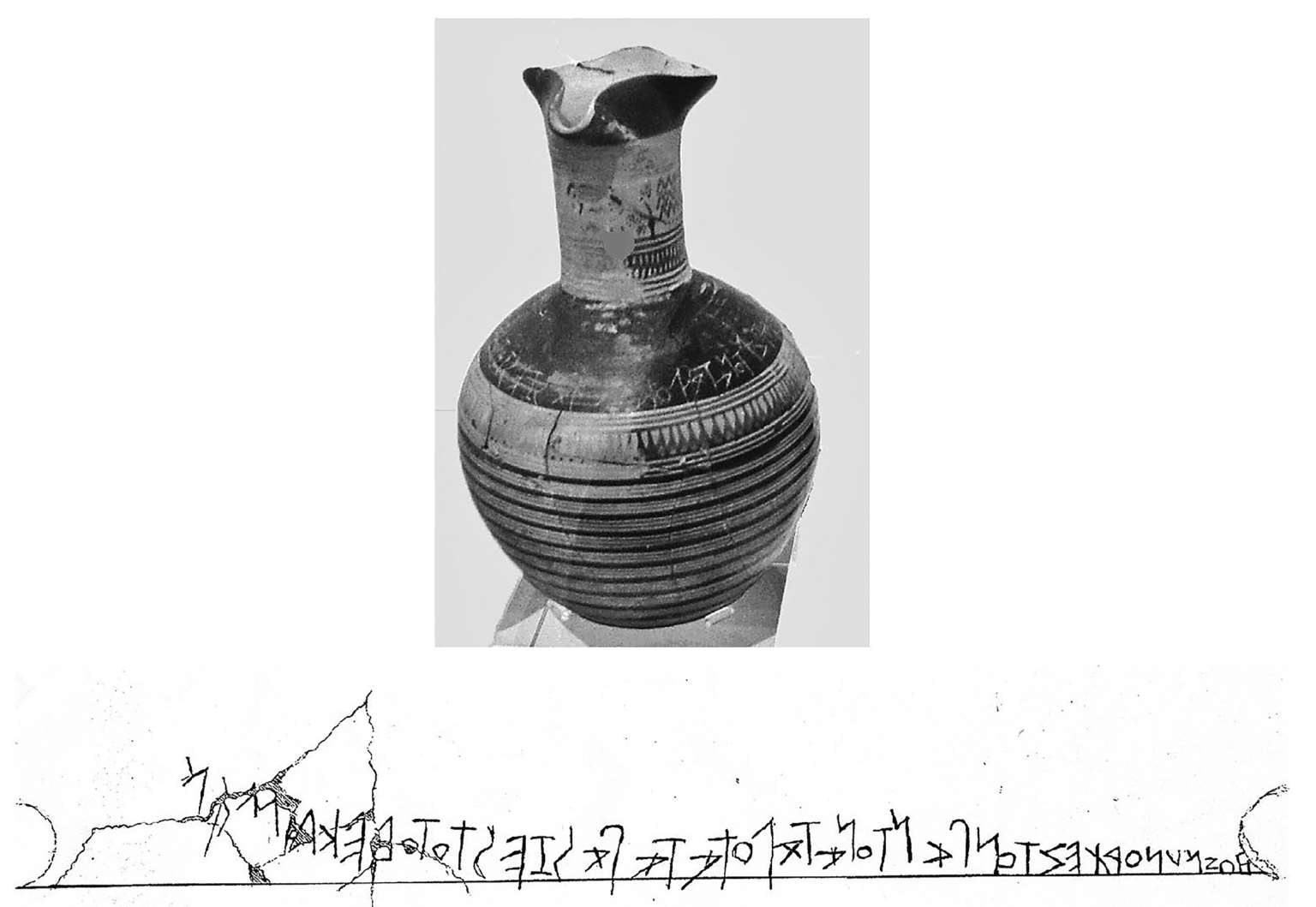 图5.7 迪普隆酒坛,1871年出土于雅典,制于约公元前740年,瓶肩附近的刻文属最古老的希腊字母铭文之一(由巴里·鲍威尔抄录)。铭文从右向左读是一句完整的六音步(荷马史诗的韵律)诗,句末有些不明字符。铭文中可辨识的部分意为:“凡跳舞的,其舞无不欢快……”显然,这个酒坛是体育竞技的奖品。从一开始,希腊诗歌就用字母来记录