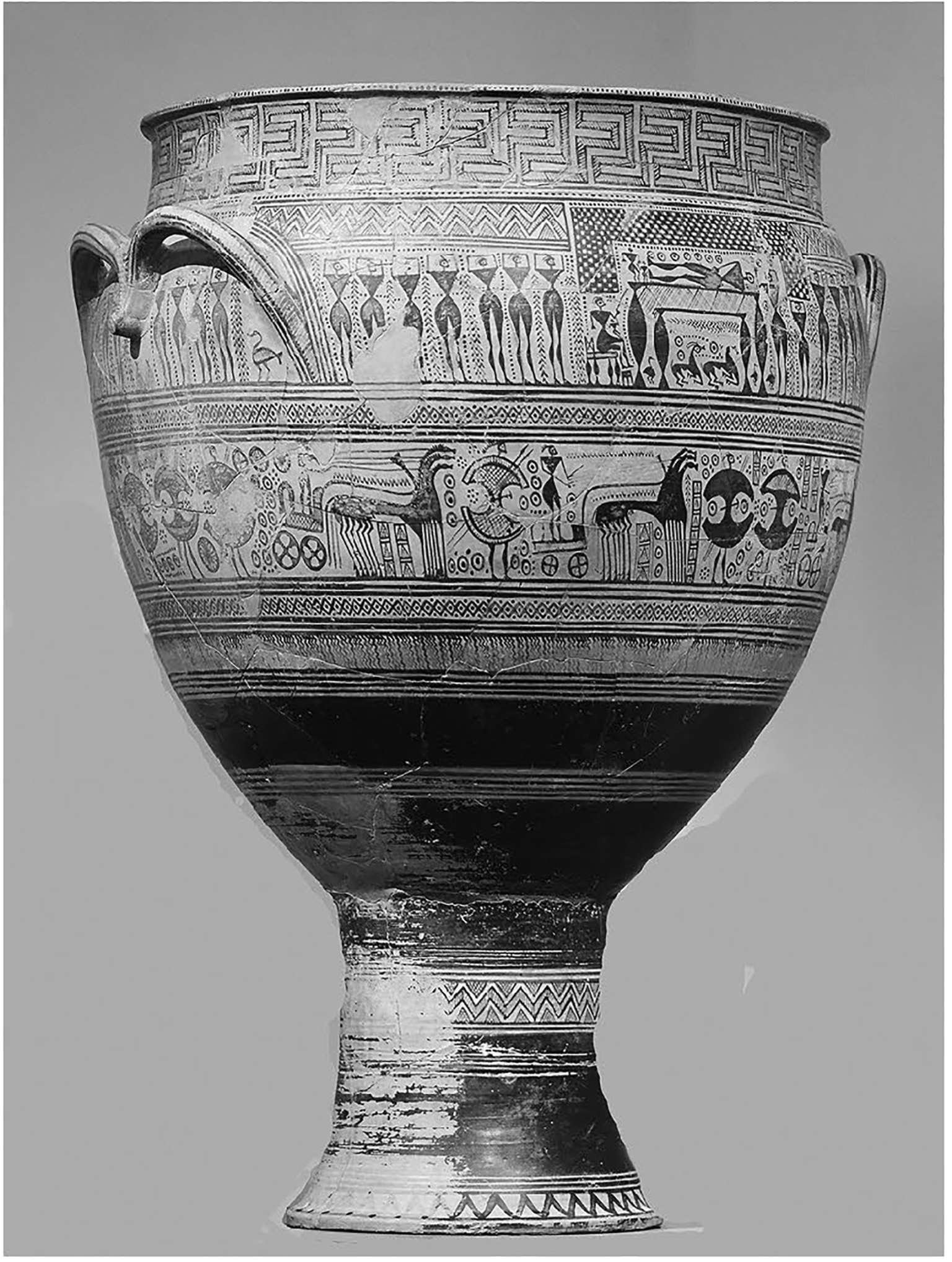 图5.6 迈锡尼时代以来最早展现丧葬、战斗场面的人物形象艺术作品。在这只来自公元前750年雅典的晚期几何学风格的调酒瓮的顶部绘画层,有一具尸体躺在棺材上,棺材两边,哀悼者撕扯着自己的头发。在下面的绘画层,战士驾驶着战车