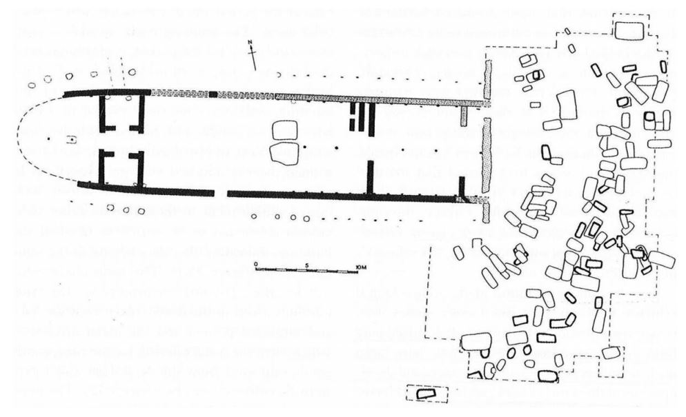 图5.3 勒夫坎第大房子的布局。中心位置的长方形表示的是发现男性被火化、女性被埋葬的地方