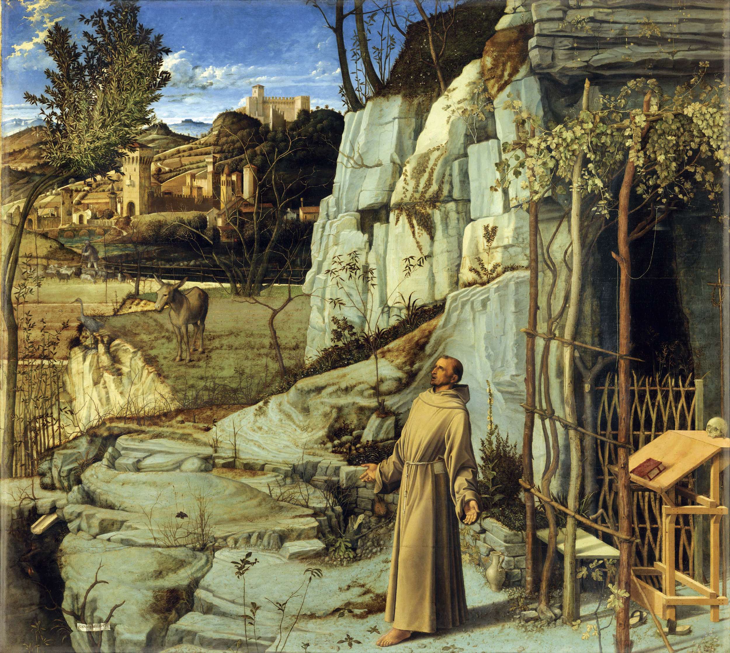 贝里尼这张画带着强烈的北方(尼德兰)特色,具有硬朗的线条、明净而克制的色彩、无微不至的细节处理。他设置了三个景别,近景是感受神迹(领受圣痕)的圣方济各,中景是一头毛驴站在草坪上,远处是一片城堡,一个牧人正赶着一群羊,暗示着世俗的繁华。画面中石梁和山坡构成了斜线,树、石崖、城堡以及石缝中的草木构成了竖线。