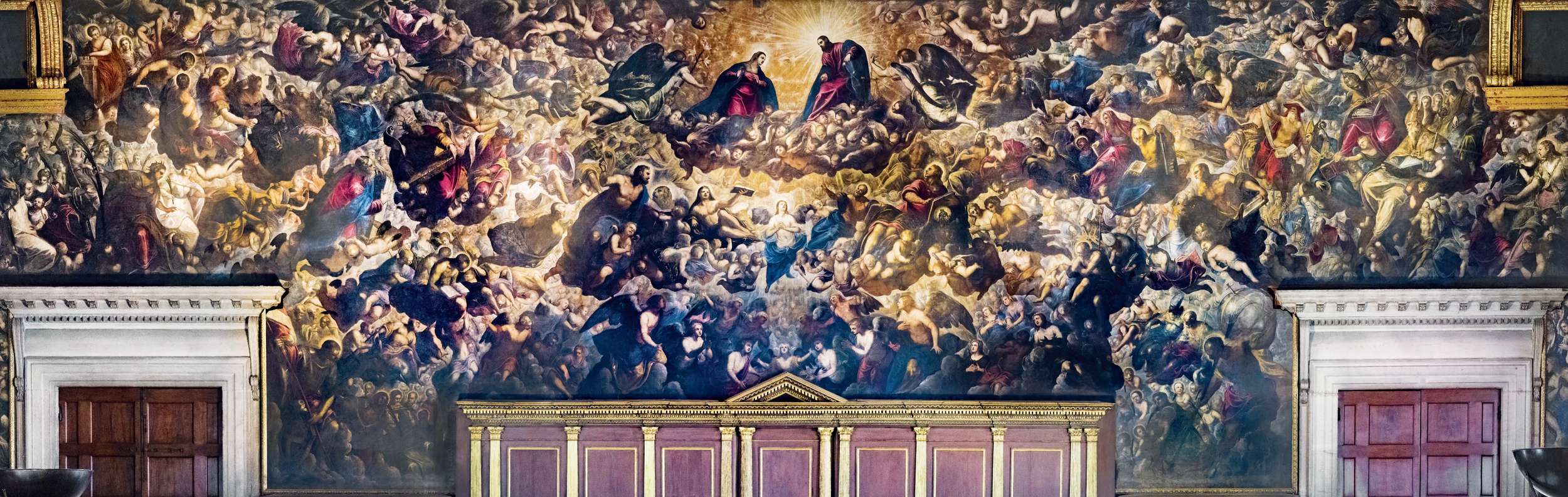 具体到画面,丁托列托面临一个透视的问题:他想要处理成完全仰视的效果,但这画毕竟是铺在墙面的上方,而非头顶的天花板。所以他略微改造了一下,截取了天顶画常用环形构图的一半,以三层弧线安排画面。耶稣和圣母在圆心处,头顶的圣光是画面最亮的部分,成为视觉中心。同时,他又用明暗的手段构成了一个金字塔形,人物的动作、服装、光线的向背严格服从这个金字塔的布局。这张画比米开朗琪罗《最后的审判》更具空间纵深。这也是他布局的特色。