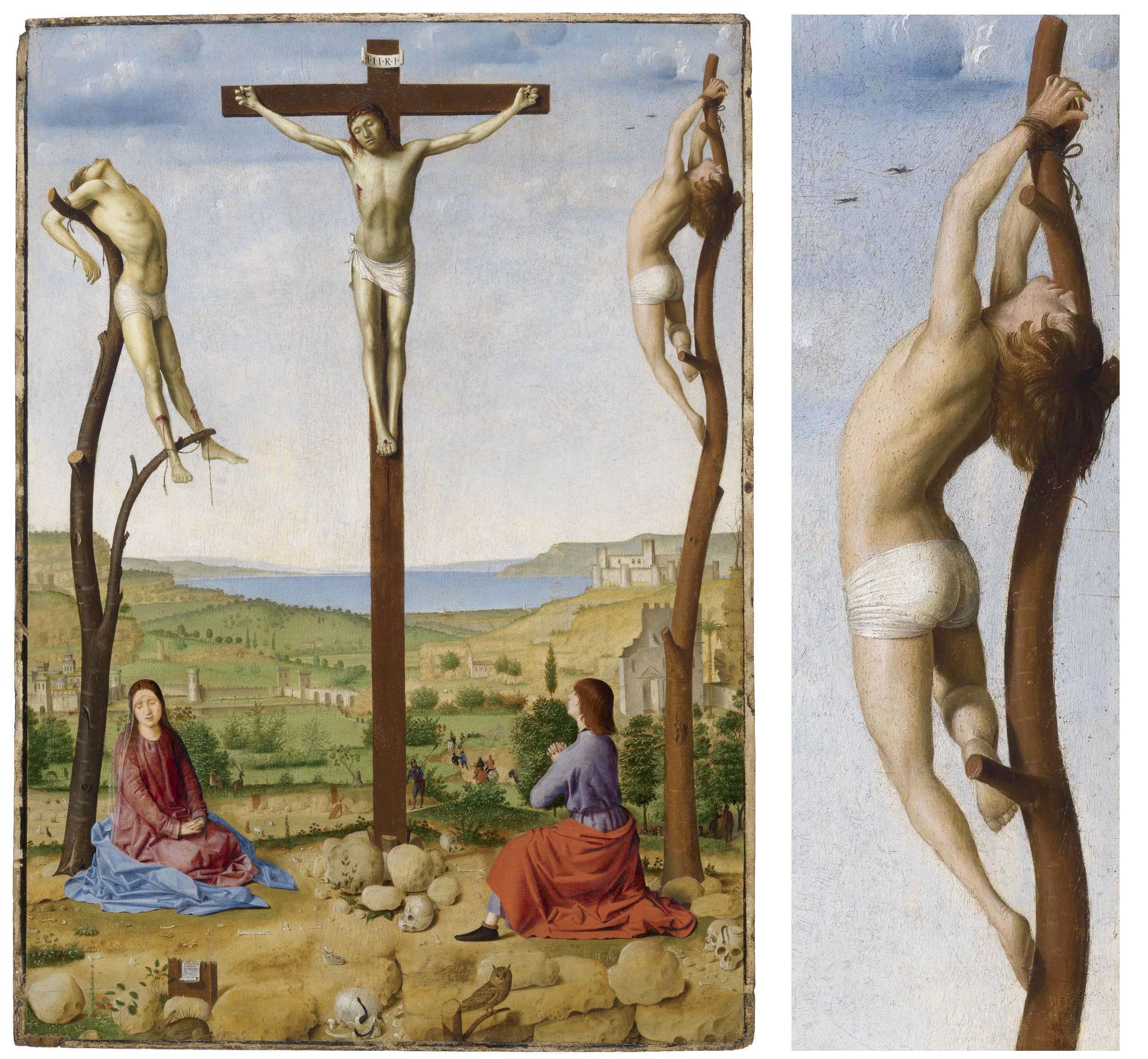 被钉十字架这个题材太多人画过,梅西纳这张仍令我过目不忘。中间十字架上的耶稣、地上哀悼的圣母尚属常规,两旁的树杈上同被钉死的强盗可就处理得太惊艳了。两人身体都朝向耶稣,一是四分之三的正面,一是四分之三的背面,两人身姿形成一种美妙的对应和互补。尤其右侧男子,身体的扭动直追古希腊雕塑,大胆、性感、柔媚,开文艺复兴之风气。
