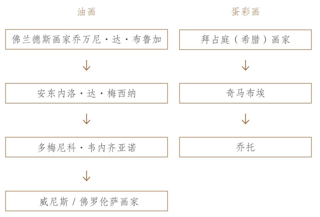 威尼斯的油画技术是由 梅西纳 从佛兰德斯带入,也就是说,从我们比较熟悉的 乔凡尼·贝里尼 开始,威尼斯已经用成熟的油画材质作画了。掌握一幅作品的绘制时间非常重要,我们可以看到风格和材质之间彼此影响的关系——佛兰德斯的传统里是没有大型壁画的,因此也缺乏充分的素描,不能形成一个完整的disegno体系。与之相对,佛罗伦萨的绘画传统来自拜占庭,奇马布埃从旅居佛罗伦萨的希腊画家那里学会了蛋彩绘画技法,经由乔托继承发扬。这里简单列出他们的传承关系: