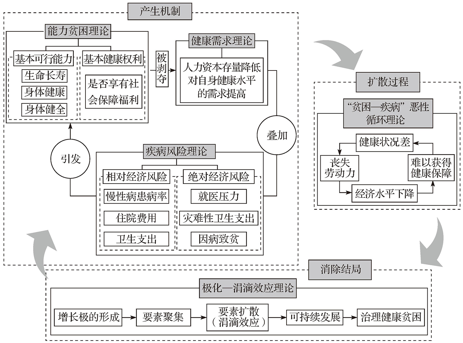 美国发展经济学家罗格纳·纳克斯就发展中国家存在的贫困问题展开了深层次的系统分析,提出了著名的“贫困—疾病”恶性循环理论。其核心观点是:资本的匮乏是贫困循环发展的根源,而资本发展不足则是经济发展缓慢导致的。低收入人群在健康状态不佳时,难以获得充足的医疗卫生服务,即使获得一定的卫生资源,也往往会由于高额的医疗卫生费用而加剧贫困,极易陷入“贫困—疾病—加剧贫困”的恶性循环扩散过程中。“贫困—疾病”恶性循环理论为我们梳理健康与贫困之间耦合关联的脉络机制奠定了理论基础。