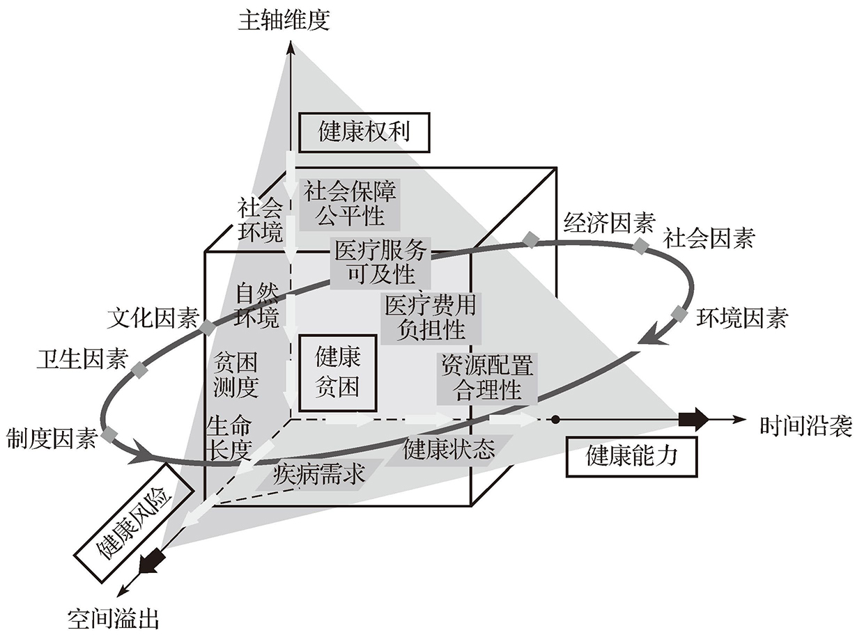 健康贫困内涵与外延的多维属性决定了不同时空尺度下,健康贫困的区域减贫驱动因素、耦合互动过程与驱动传导机制呈现出复杂的非线性动态演化特征。减贫格局的时间沿袭惯性与空间溢出性,成为健康贫困发生、识别、干预与阻断的着力点。关注健康贫困评价的时空维度,刻画健康贫困的时空环绕变迁轨迹,对后续制定有针对性的、可持续性的健康贫困治理策略至关重要(见图2-2)。
