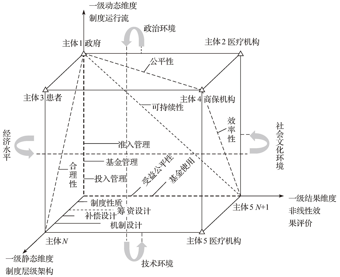 基于上述对大病医保和复杂自适应系统相关概念和理论、复杂自适应系统相关要素特征的总结梳理,将大病医保和复杂自适应系统的相关要素进行萃取融合,可构建出三维立体式的理论分析框架(见图2-3)。