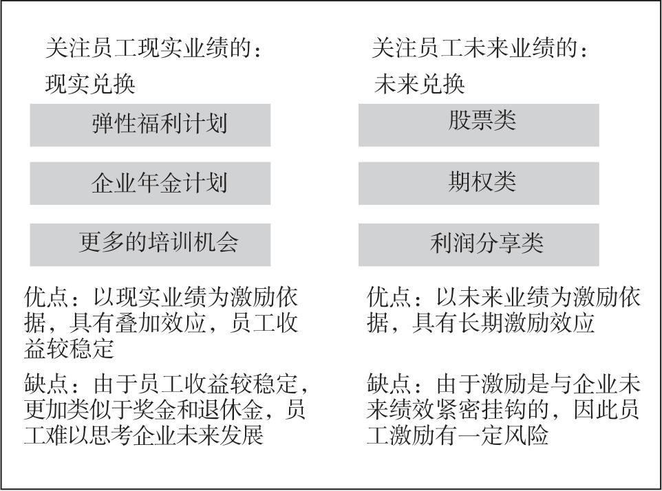 完善薪酬结构激励的长期性对留住员工来说意义重大。无论是阿米巴巴长还是普通员工,都应该被作为激励的对象。激励的手段可以根据实际情况多样化。例如对有突出贡献的技术人员和管理人员可以实行股票期权制,这就是一种长期激励的方式。在薪酬制度方面,企业要注意完善薪酬结构。完整的薪酬结构包括工资结构、奖金结构、福利待遇和激励制度。在福利待遇上,企业可以根据具体情况有所创新。对员工现实业绩与未来业绩的不同激励方式的对比如图1-3所示。