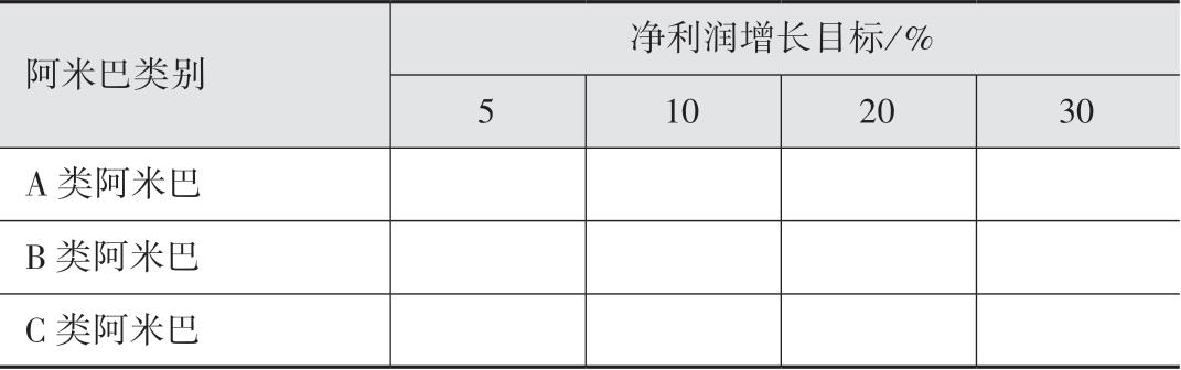 (2)目标设置:集团根据各阿米巴发展阶段、各阿米巴面临的市场竞争等将集团以下各阿米巴分成四类,每个类别阿米巴按照表1-2中的目标每年执行新的利润目标。