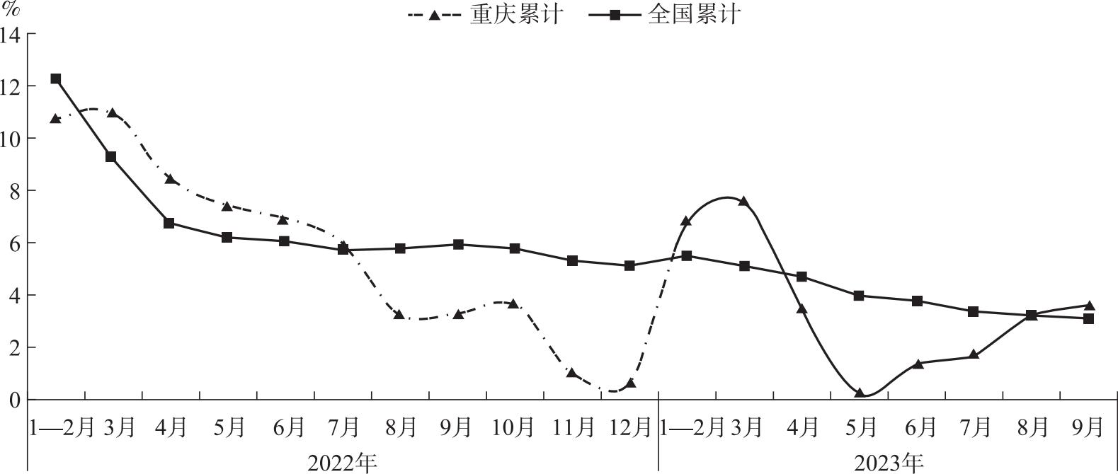 投资增速低位回升。重庆积极落实系列稳投资政策举措,深入实施“抓项目促投资”专项行动,投资运行保持回升态势。1—9月,重庆固定资产投资同比增长3.6%,自5月以来逐月回升,高于全国同期0.5个百分点,在全国排第16位,较上半年提升4位。其中,民间投资增速由上半年的-8.6%收窄至-4.0%。市级重点项目加快推进,百亿级项目带动显著。1—9月,市级重点项目完成投资3584亿元,投资进度达到81.4%,快于预期目标1.4个百分点,其中百亿级项目投资对全部重点项目投资增长贡献率达22%;重庆共建成渝地区双城经济圈重大项目年度完成投资2853.5亿元,同比增长72.2%。基建、工业投资较快增长,房地产开发投资降幅持续收窄。在城建、农林水利、能源等领域项目带动下,基建投资同比增长9.3%,较上年同期高1.3个百分点。随着新能源汽车相关项目、大型能源项目等加速在渝布局,工业投资增速由上半年的8.8%提升至12.2%,较全国同期高3.2个百分点;其中汽车、能源产业投资增速均超20%。1—9月,基建和工业投资合计拉动整体投资增长6.1个百分点。随着“保交楼”工作有序推进,房地产开发投资降幅由5月低点(-23.1%)收窄至15.7%。
