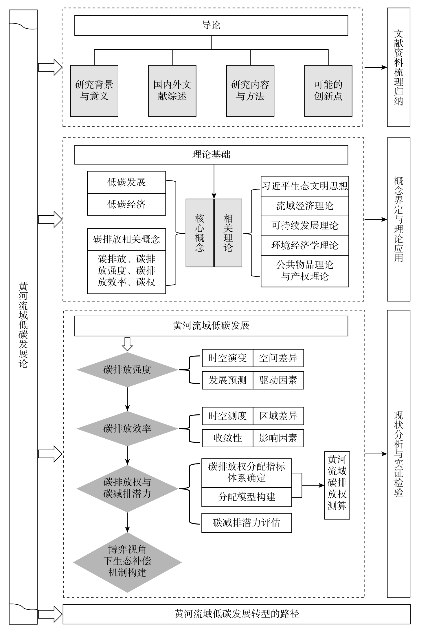 本书通过搜集、梳理、归纳、总结黄河流域低碳发展、碳排放等方面的相关文献,明晰流域低碳发展相关概念与理论,掌握流域低碳发展领域最新的研究动态,进一步分析当前流域低碳发展领域的研究不足和创新点,选择并构建适合本书的研究方法及模型,为本书的进一步研究指明方向,最终形成严谨的研究思路。